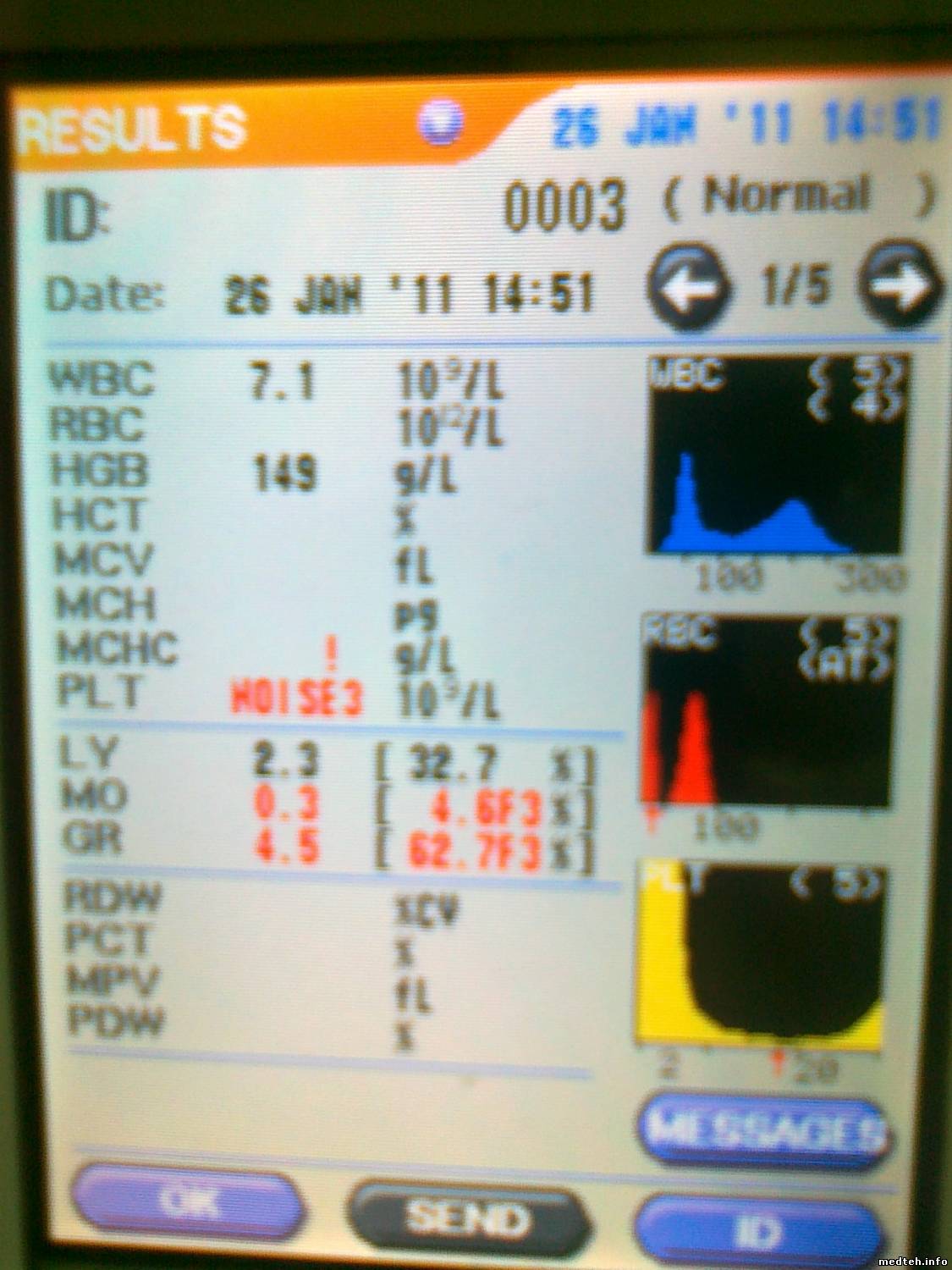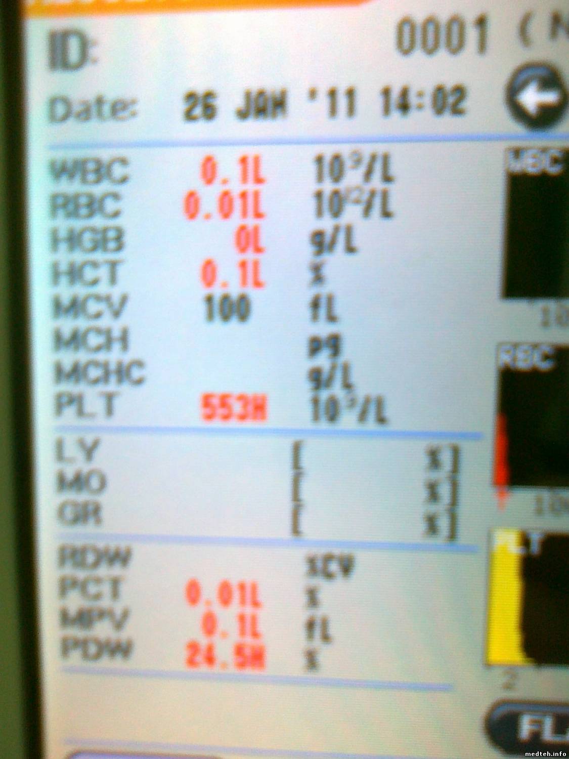 scratch2010, что за кровь? судя по графикам как будто эритроциты очень сильно разрушены и пролетают через апертуру как тромбоциты. Что с журналом ошибок? Background что показывает?