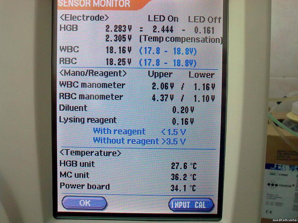 на счет гемоглобина такое напряжение было из за того что электрод поставил строго по середине и он попал на против гемоглобинового датчика. На данный момент промывка не помогла, сейчас на WBC - OVER; RBC - BBL4. остальные параметры не выводятся. При измерении жидкость в манометрах поднимается ровно без пузырей но примерно к концу измерения начинается очень частый писк и пересчет бывается более 2-х раз.