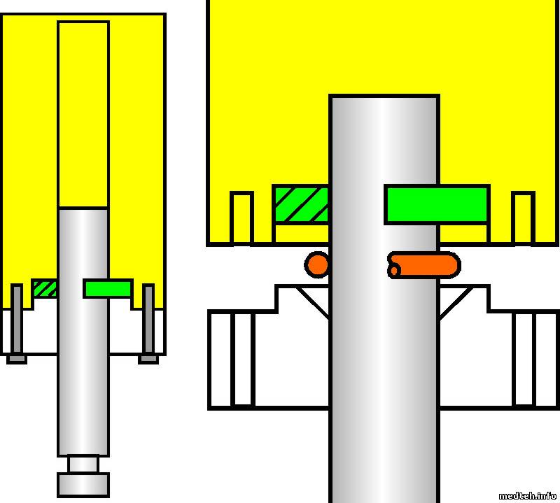 Уплотнительное колечко - из рыжей резины подходящее по диаметру поршня. Можно такое найти на верхних концах волюметрических трубок того же МЕКа под заглушками, а вместо них положить кружочек из тонкой резины. Посадочное под новое колечко желательно делать методом заплавления какого-нибудь подходящего мет. конуса, хотя не критично абсолютно, лишь бы не обычным сверлом (стенки тонкие). В полевых условиях можно просто прижать новое кольцо к старому уплотнению, но на прижимные болты надеть дистанционные шайбы (например обрезки жесткой трубки) чтобы кольцо не расплющило сильно и винты не раскрутились со временем. Все пространство вокруг кольца забить густой силиконовой смазкой. Сам поршень тоже смазать тонким слоем. Остальные поршни тоже не помешает смазать не разбирая. Из-за смазки в 50% возникает небольшой фон, пропадающий после промывки или через несколько холостых проб.