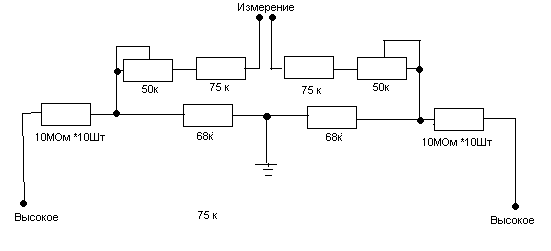 Уважаемый shnyder777, Ваша схема красива, но может дать только качественную картину исследуемого процесса, поскольку: 1. Отсутствует компенсация переменной составляющей, которая имеется в реальных устройствах - параллельно резисторам должны стоять конденсаторы (высоковольтные). Номинал этих конденсаторов - отдельная песня. 2. В нижнем плече делителей Вы установили 1 МОм. Следовательно, для получения достоверных результатов, измерительный прибор должен иметь входное сопротивление не менее 10 МОм - не всякий осциллограф, а тем более тестер может похвастать таким параметром. 3. Конструктивное оформление делителя имеет свои хитрости, т.к. необходимо скомпенсировать емкостные токи по всей длине делителя. Это достигается экраном специальной формы. Не сочтите эти замечания пустой критикой. Если Ваши намерения серьёзны, поищу что нибудь в литературе.