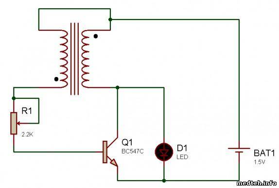 Электролитические конденсаторы имеют не только емкость но еще и сопротивление, что усложняет дефектовку. Предлагаю сделать приборчик для проверки внутреннего сопротивления кондеров. Схема представляет собой простейший блокинг-генератор на одном транзисторе. Это схема простейшего фонарика со светодиодом на одной пальчиковой батарейке (1,5в) Вот схемка.