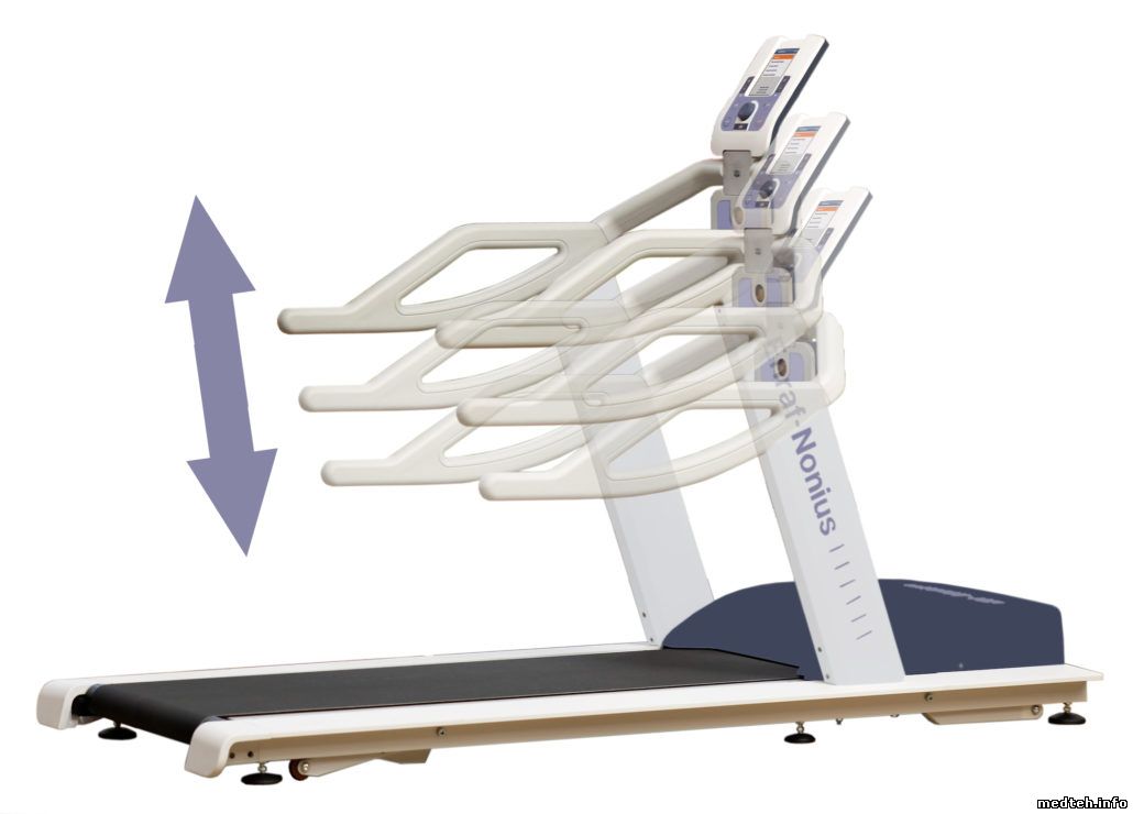 Новая модель беговой дорожки оснащена цветным ЖК дисплеем, возможностью обратного наклона бегового полотна, низкой высотой полотна над уровнем пола (что важно для людей с ограниченной подвижностью), дополнительными боковыми поручнями, бесконтактным датчиком положения пациента, электрической регулировкой положения поручней, имеет малый уровень шума.