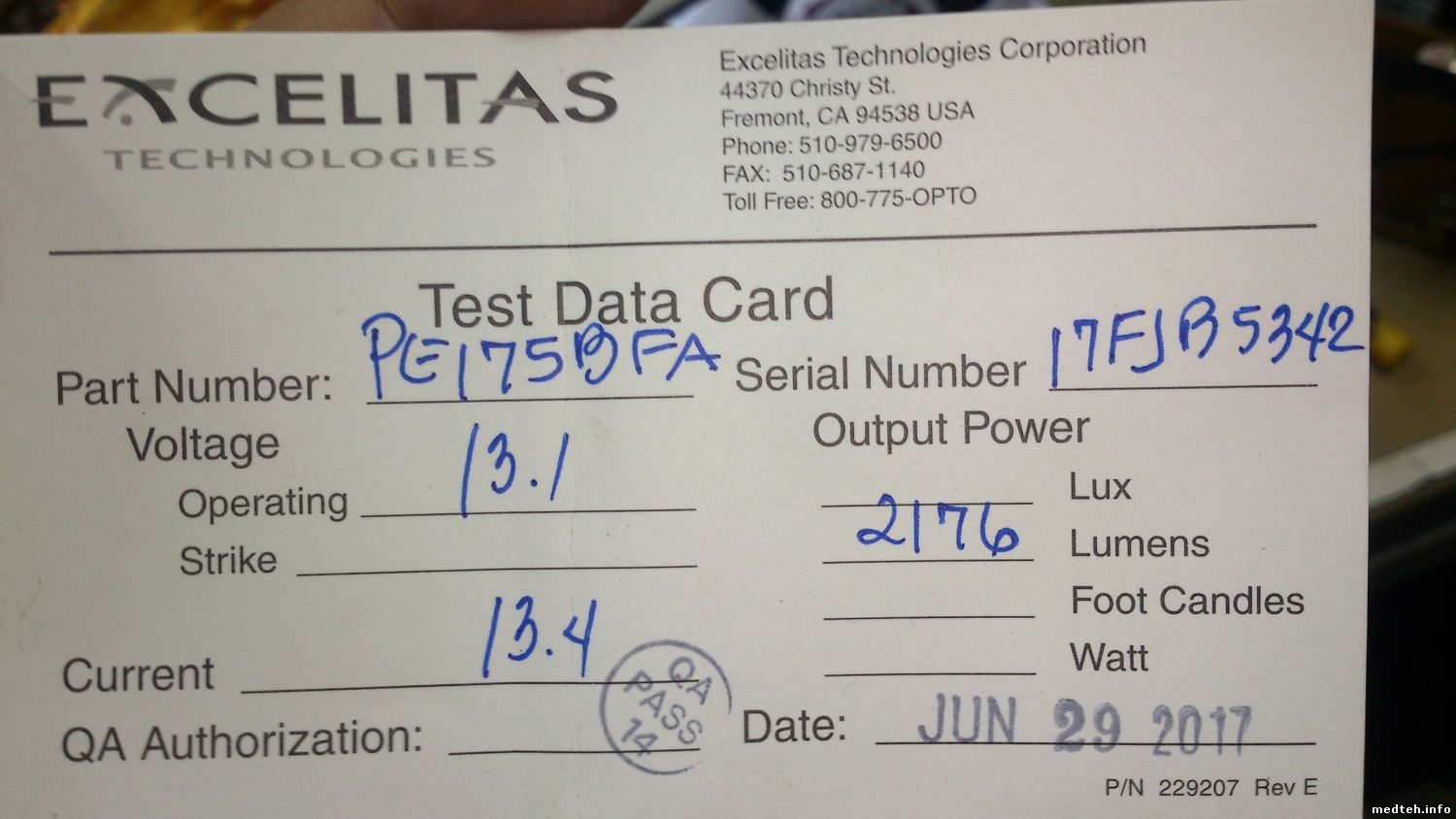 Это похоже на серийный номер. ИМХО, там стоит PE175BF. Фото бы не помешали. То, что на стене Вы видите "костер" это нормально - вы видите потоки газа в лампе. В световоде всё это перемешается и на выходе будет равномерный пучок. Вот если дуга прыгает и меняет свою интенсивность, что выражается в скачкообразном изменении освещенности, это значительно хуже. Проверьте люксметром на выходе световода что происходит на самом деле. Измерьте мощность, подводимую к лампе. Потом уже можно думать что делать.