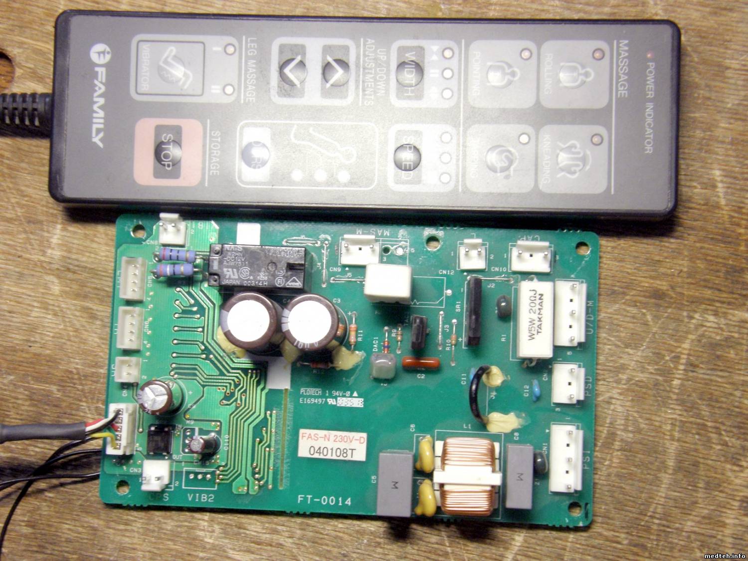 Подобные платы стоят в операционных столах применяемых в ЛОР и офтальмологии, они больше на кресла похожи. Были три случая; в первом - проблема с зарядом аккумулятора, во втором - замкнул датчик, в третьем внутри пульта стоит микросхема(ы), котрая при падении пульта, частично отвалилась. Во всех случаях было похоже на контроллер. У тебя оно себя как ведет?