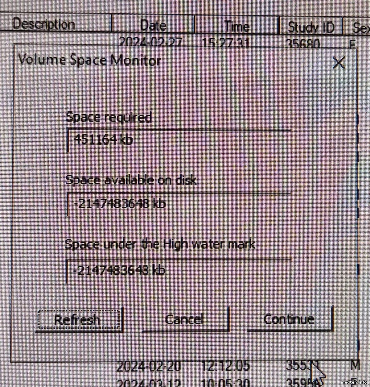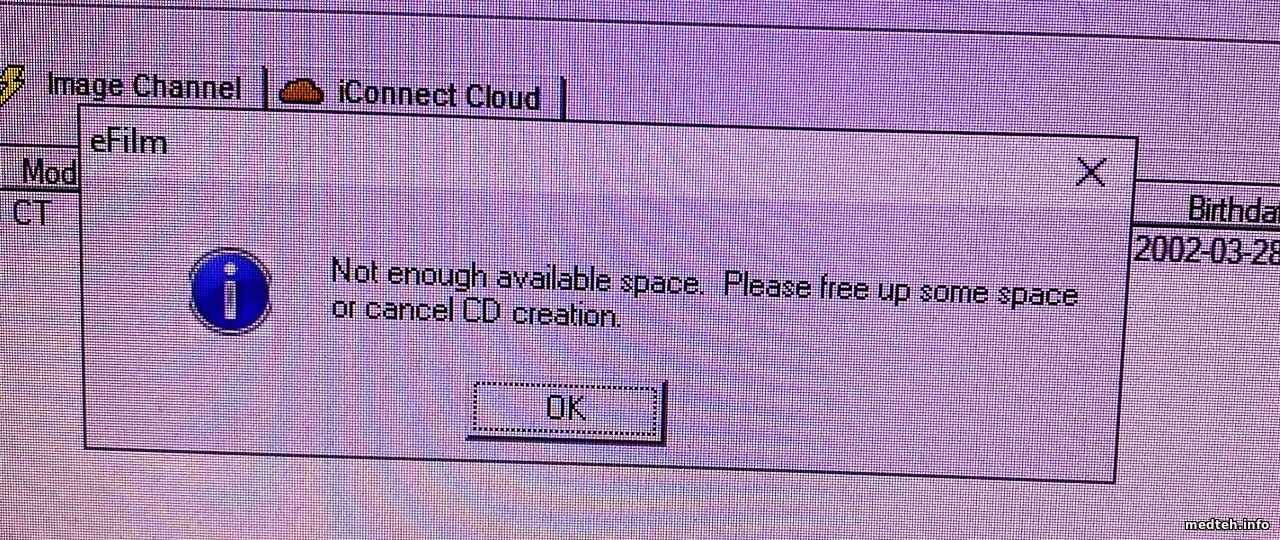 Суть проблемы в чём: поменял жёсткий диск под базу eFilm. Базу просто перекопировал. Всё работает кроме одного - не выгружает обследования и не записывает диски. Пишет сообщение о не хватке места, потом показывает окно монитора памяти диска. Хотя свободного места больше 2Тб. Версия Efilm 4.2.2.