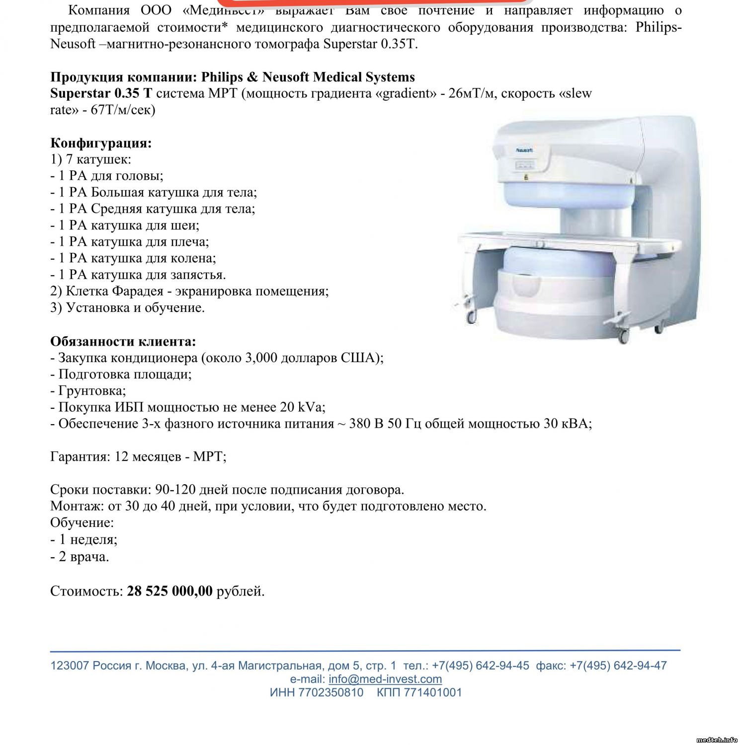 Добрый день! Прошу посоветуйте! Планируется открытие нового диагностического центра. Работа будет связана с травматологическими, ортопедическими, ревматологическими, неврологическими и педиатрическими больными. Исследования костей, мягких тканей и ЦНС. Ищем соответствующее медицинское оборудование для проведения качественной диагностики. Нас интересуют КТ и МРТ сканеры. Порекомендуйте и по возможности предложите свои варианты. Хотим недорогой в обслуживание быстро окупаемый томограф. С уважением Григорий Гут. тел. 0933946338 ggut12345@gmail.com