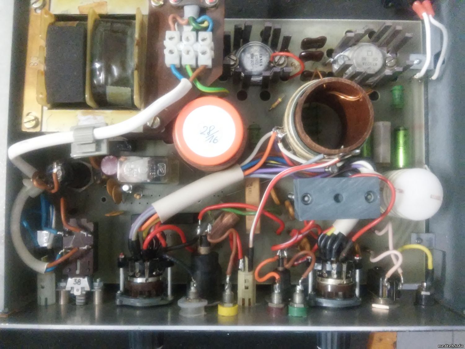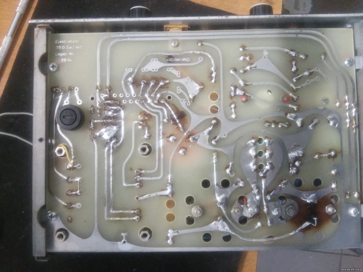 Попался даный апарат, первоначально было короткое в одном транзисторе(была сопля, устранил) после нажатий раз 4 на педаль транзисторы розогревались как печки. После нкдолгих мучений умер транзистор kd503 второй kd502 жив больше в апарате ничего нету, одни катушки и резисторы с конденсаторами.