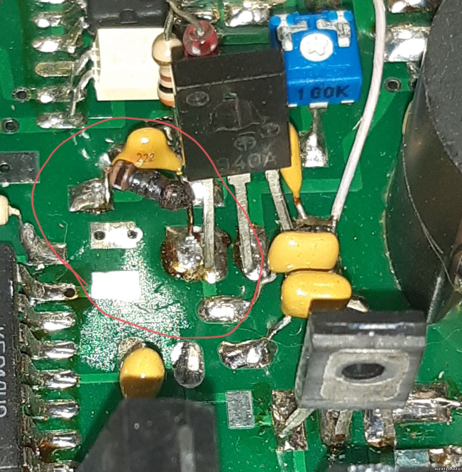 Добрый день. Аппарат ЭХВЧ-МТУСИ изготовитель МТУСИ г.Москва - цифр нет. Регулятор мощности разградуирован до 50. Выход 1 Р = 3 Вт (?) R=800 Ом. Выход 2 Р = 50 Вт, R=800 Ом. Сгорело всё, что описывалось выше. И не могу определить номинал резистора (выгорел), идёт на эмиттер КТ940А. Помогите опознать номинал резистора.