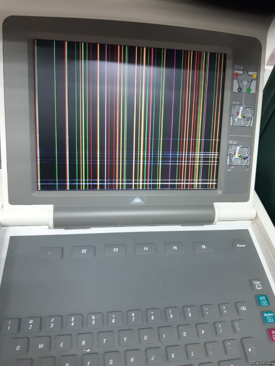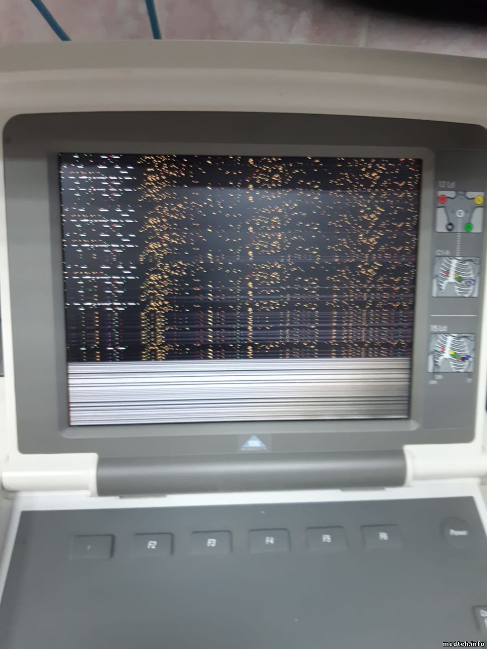 был очень похожий случай с MAC 500. Оказалось на печатающей головке образовался нагар от использования неродной (некачественной) ленты. Вылечилось путём протирки головки спец. чистящим карандашом, который шёл в комплекте с кардиографом NIHON KONDEN.