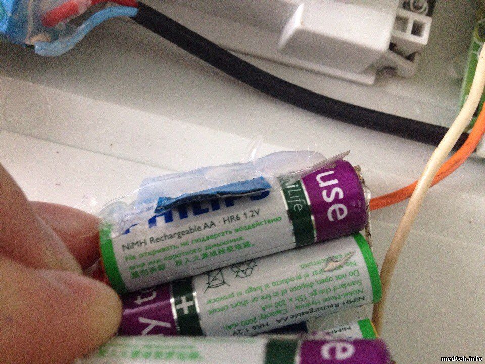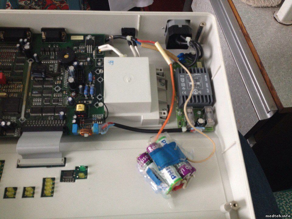 Паспорт на фотографии от другой модели кардиографа. Конкретно в этой модели (Heart Mirror 3) стоят NiMH аккумуляторы (5-ть банок). Располагается аккум под платой и крепится к плате стяжкой (видна на фото). Аккум на фото - это чьё-то народное творчество. Не удивлюсь, если эта сборка припаяна параллельно к родному аккуму ...