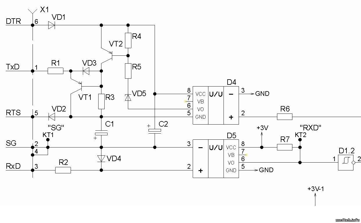 посмотрел тестером питание оптрона со стороны интерфейса - не поступает (сигнал DTR (+12В) поднят). значит питается из точки с вопросом (см. фото). осциллограф показывает что импульсы от PIC-а к интерфейсу (в сторону оптронов) идут и изменяются при замыкании всех электродов. может DC/DC-преобразователь в эти точки ставиться? а какой?