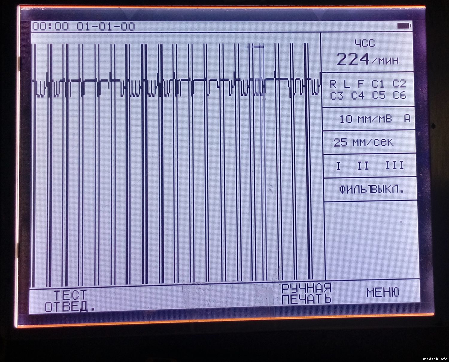 Такое на дисплее при неподключенном кабеле. Может кто встречался, помогите, где искать. При тесте отведений показывает на всех 70мВ (и при подключенном кабеле с симулятором, и при отключенном)