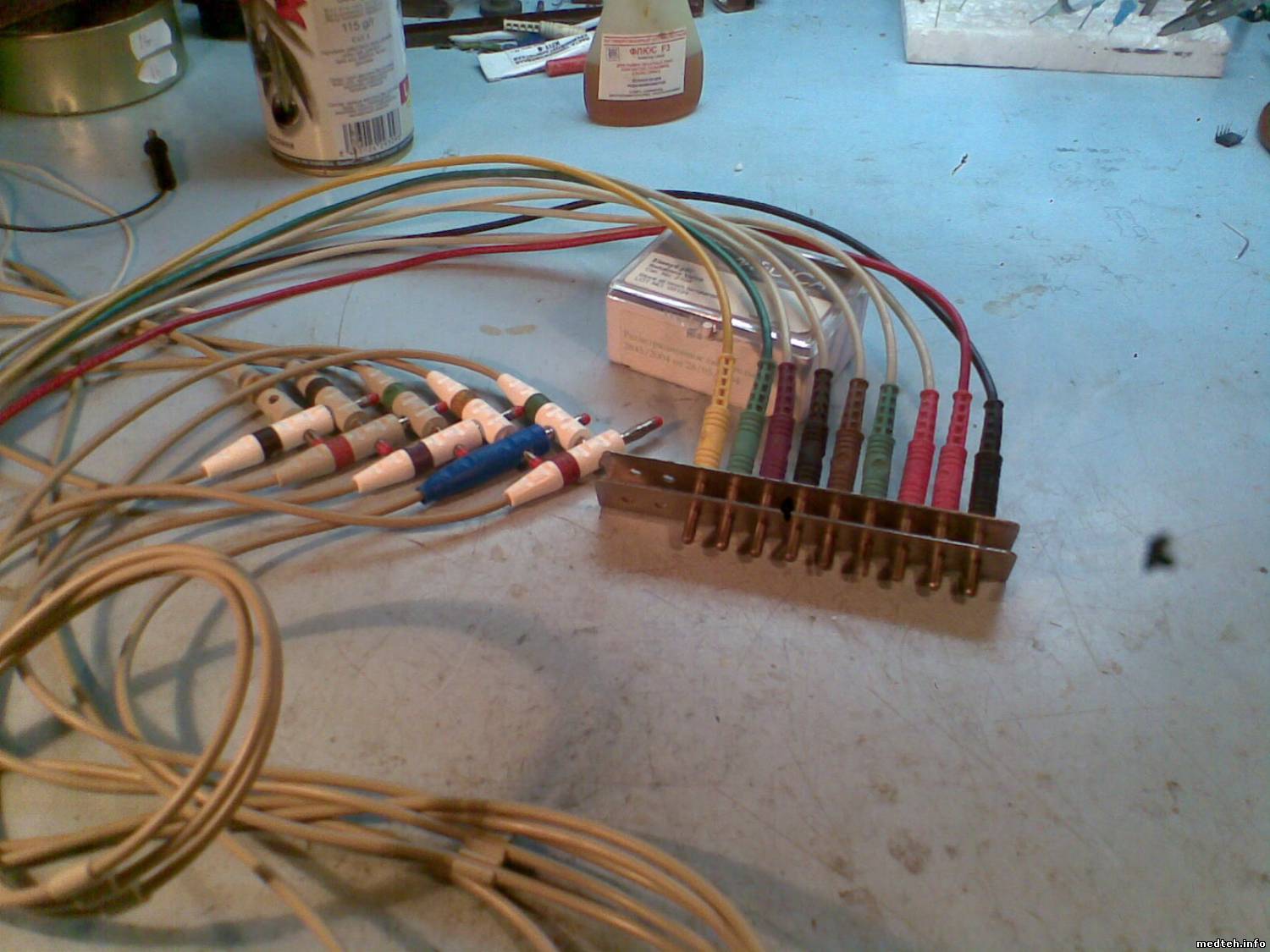 Автор, имей в виду, что инномедовские (и многие другие) кабели имеют проводящий слой на внешней стороне центральной жилы (черное покрытие, свободно удаляемое ножиком). при пайке это покрытие надо зачищать в месте ремонта. Иногда бывает так, что ЭКГ пишет красивый сигнал с имитатора сердцебиения, а при снятии ЭКГ с человека-прямые линии. Это тоже говорит о том , что где-то замыкание на экран.
