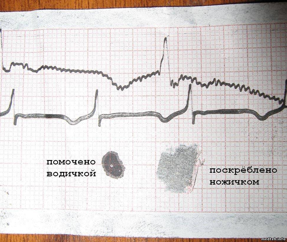 Старая же бумага весьма хитрой "конструкции". Выглядит как обычно, но на самом деле скрывает черный непросвечивающий слой, покрытый сверху белым матовым термослоем с сеткой, который под пером то ли проплавляется, то ли испаряется, то ли химически обесцвечивается, но кривая ЭКГ есть обнаженная черная сущность бумаги. Также можно процарапать норгтем или продавить чем-то твердым.