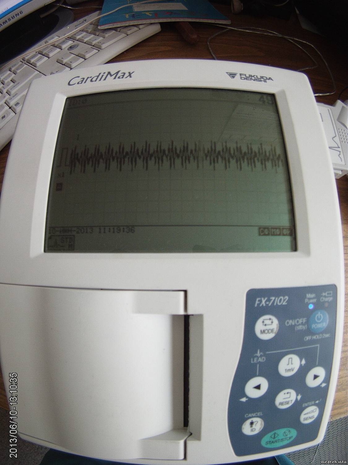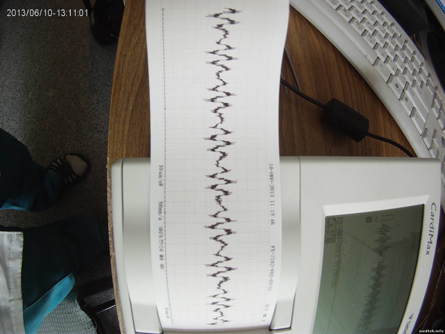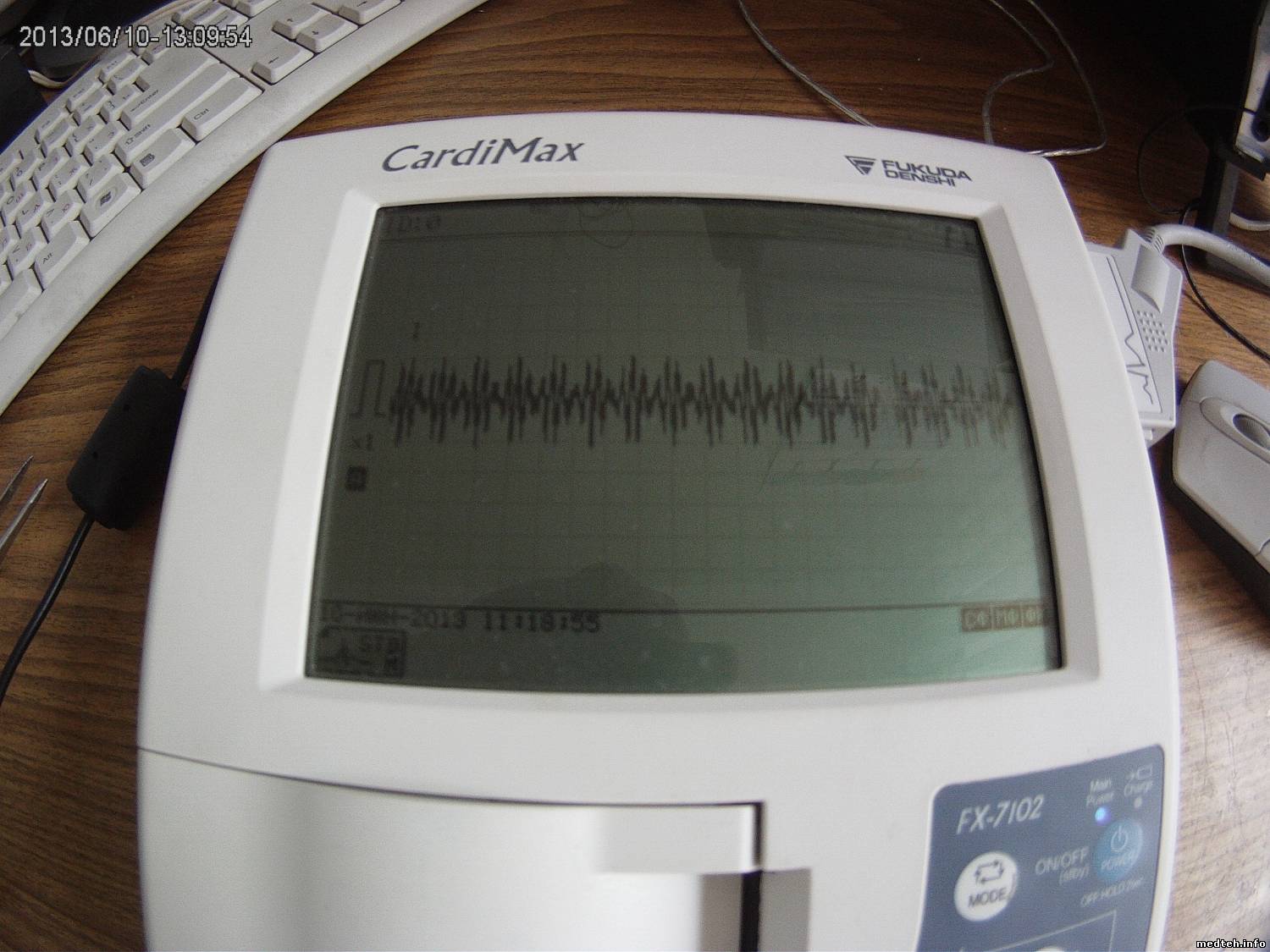 Здравствуйте! Пришел в ремонт кардиограф CardiMax FX-7102 ф.Fukuda Denshi. Как пологается ремонт начал с кабеля отведений. Прозвонил, проверил на излом, проверил на замыкание "экран-электрод" и обрыв экрана. Короче? кабель целый - 100%. Подключил кардиограф к генератору ГФ-05, форма сигнала - синусоидальная ...И вот что он выдает по всем отведениям (фото приложил). Наложил электроды на себя, тоже примерно что и от генератора, только "мусора" больше ... И настройки все уже "перекопал" и замыкал все электроды (чистая, прямая линия - всё ОК). В настройках включал тестовые ЭКГ, все отлично по всем отведениям. Кто может сталкивался с такой неисправностью???
