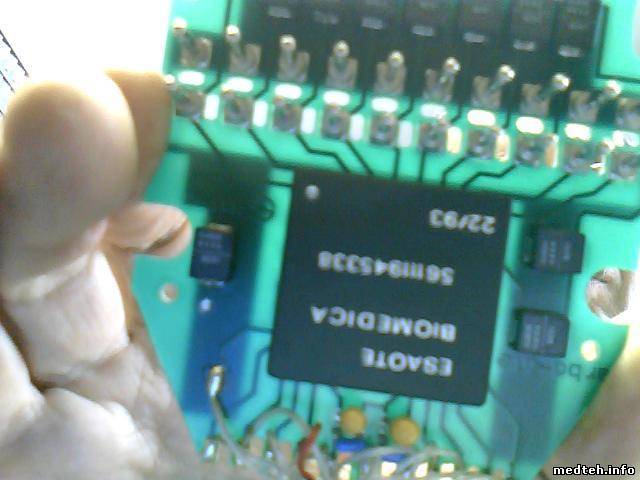 Каждое отведение защищено варистором. Oтводы подходят к какому-то элементу, или микросборка или микросхема и с неё на разъём который идет в кардиограф. В интернете найти на неё данные не смог. На ней написанно: