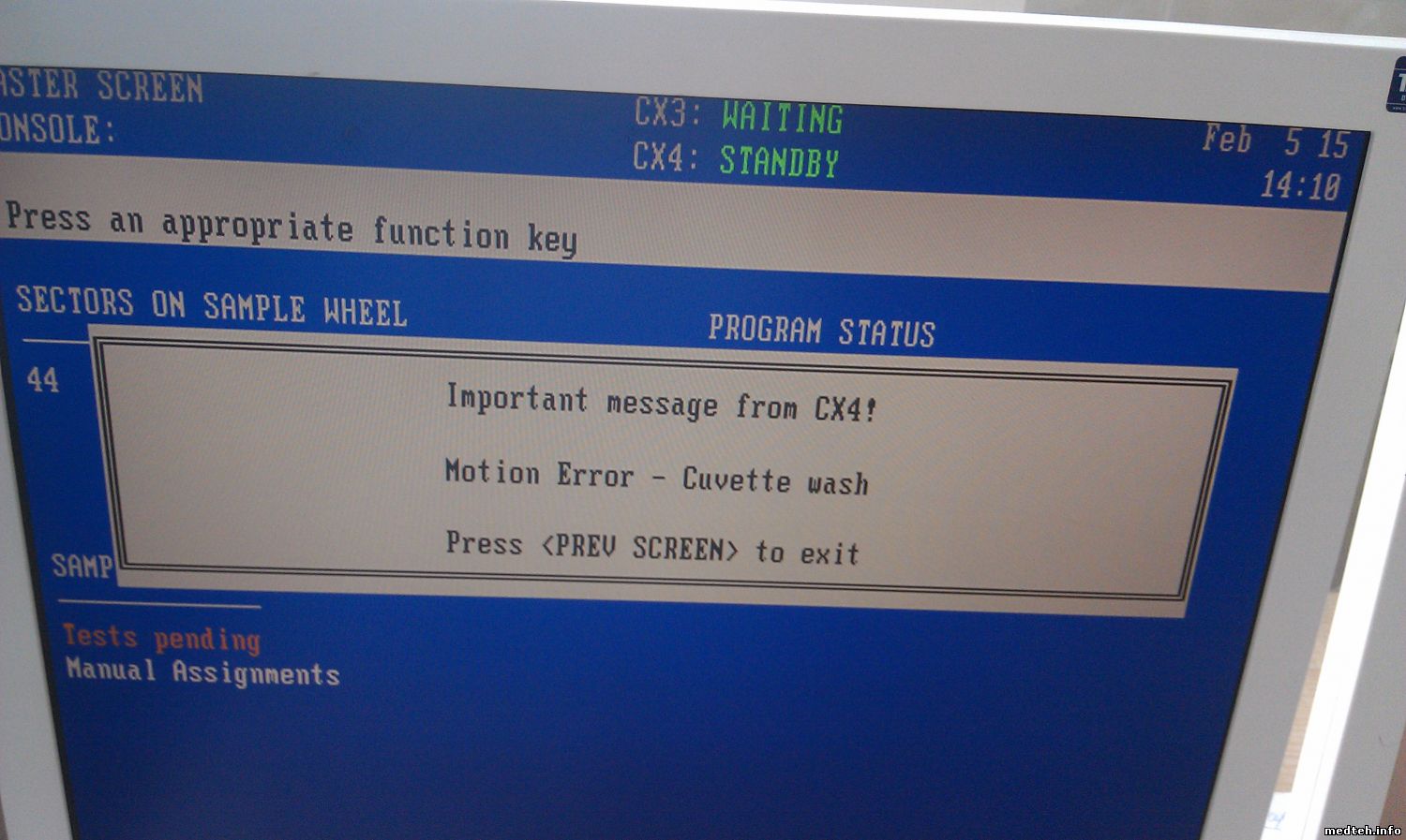 Здравствуйте. Beckman coulter Synchron CX 9 PRO. Запускался нормально, промывку проходил нормально, при работе выдал: "Important message from CX4! Motion Error-Covette wash". При перезагрузке аппарата выдает эту же ошибку.
