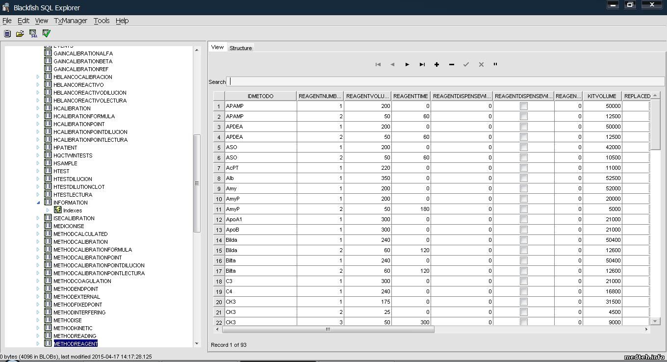 Добрый день, информацию по реагентам, методикам/каналам - открытие/закрытие/редактирование и пр. можно найти в файле DataBase.jds. Папка database. Нужно установить BlackFish SQL 8 и подключиться к DataBase.jds.