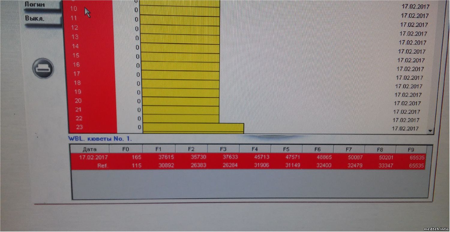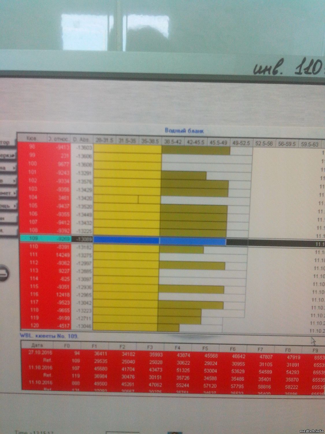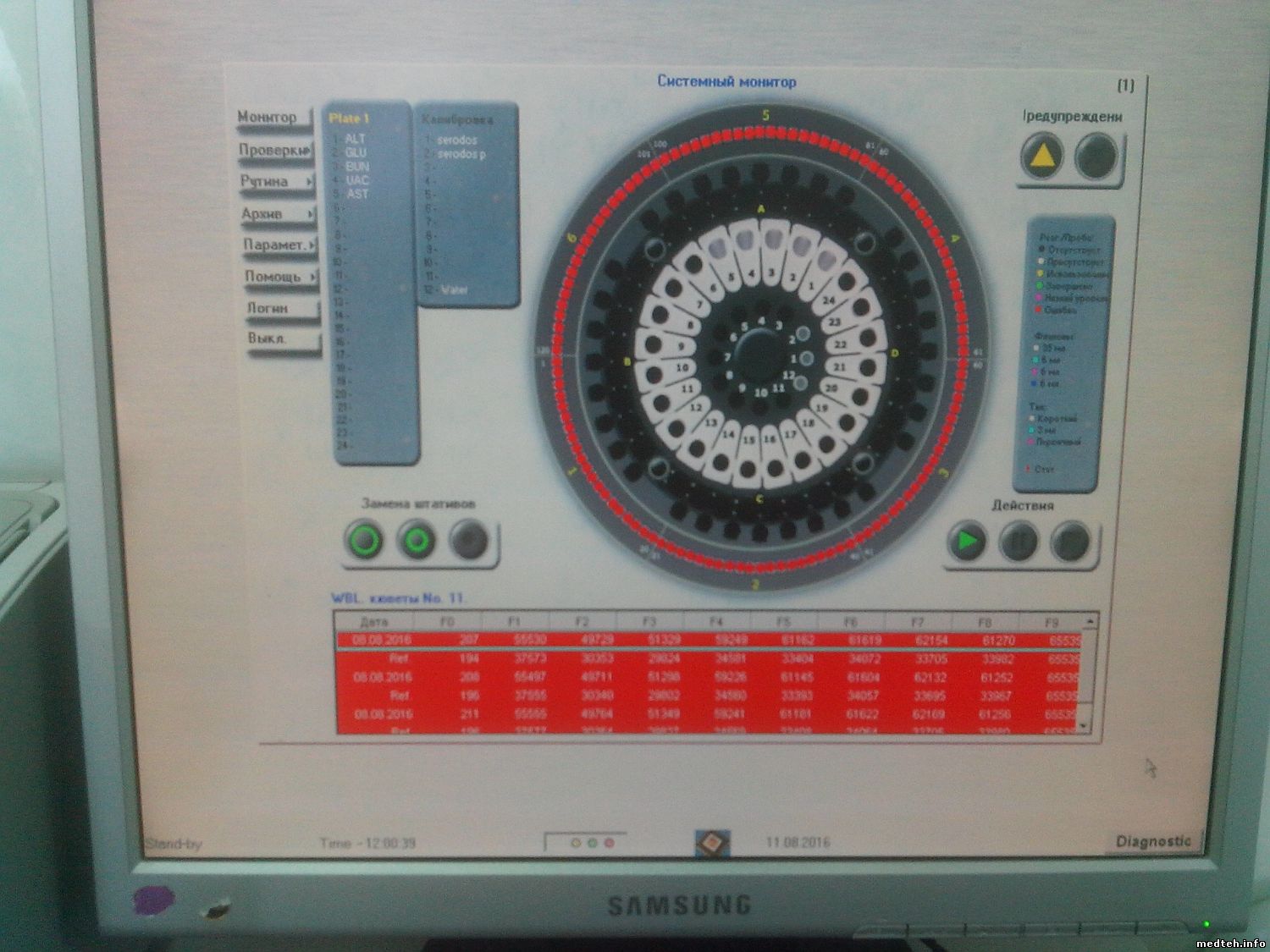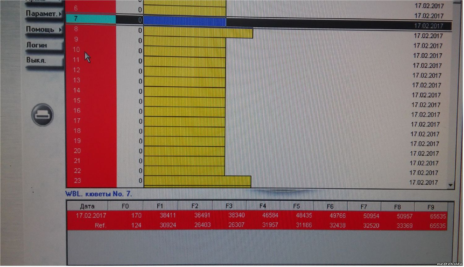 Я такого ещё не видел. Судя по картинке всё должно быть нормально, но кюветы в красной зоне. Возможные причины по вероятности (по моему мнению) 1) Игла пробоотборника забита и наливает мало или с пеной. При WBL остановить и проверить наличие жидкости в реакционных кюветах 2) Лампа на пределе и «мерцает» В диагностике проверить уровень сигнала, изменения должны быть не более чем +/- 00009 за 5 мин. (пример: 45899+/-00009) 3) «Сдохло ПО» Сохранить предыдущее и установить англоязычную версию и проверить WBL. Дальше-по результатам диагностики.