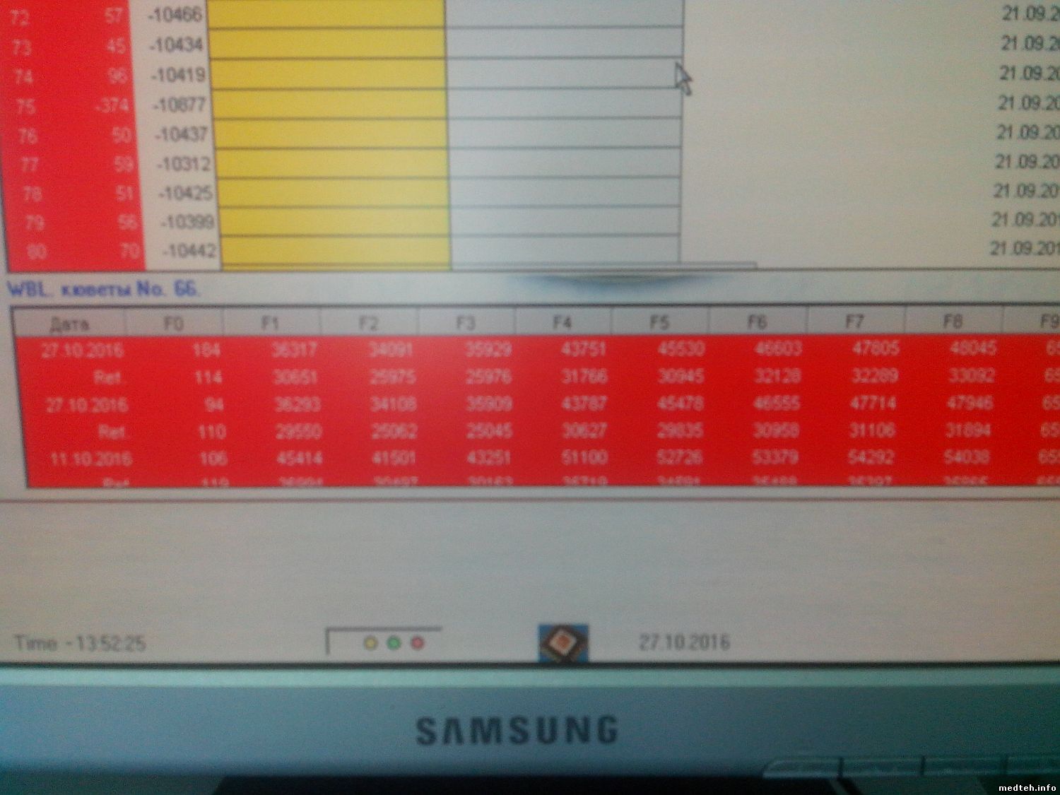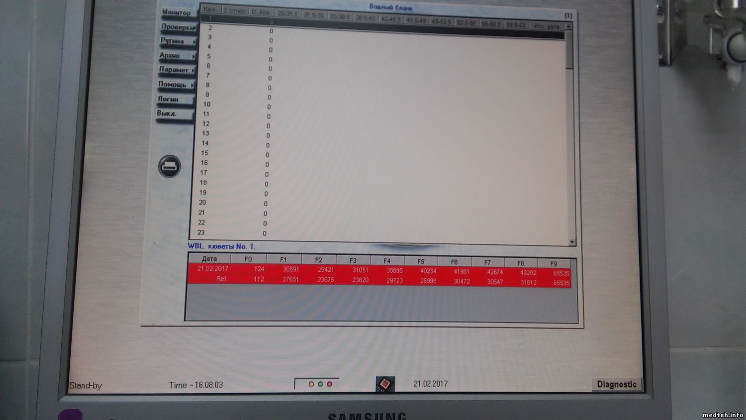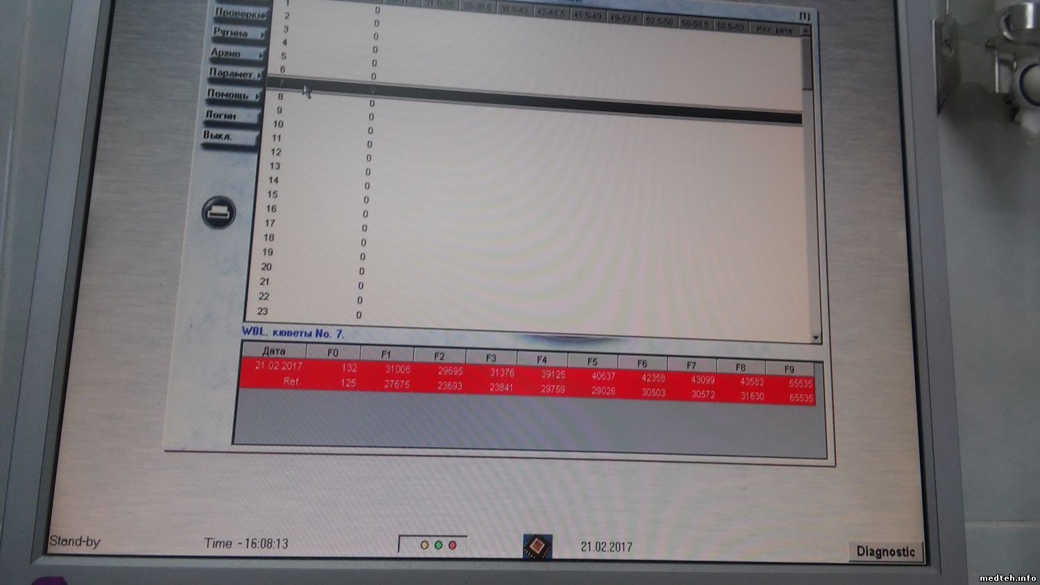 Я такого ещё не видел. Судя по картинке всё должно быть нормально, но кюветы в красной зоне. Возможные причины по вероятности (по моему мнению) 1) Игла пробоотборника забита и наливает мало или с пеной. При WBL остановить и проверить наличие жидкости в реакционных кюветах 2) Лампа на пределе и «мерцает» В диагностике проверить уровень сигнала, изменения должны быть не более чем +/- 00009 за 5 мин. (пример: 45899+/-00009) 3) «Сдохло ПО» Сохранить предыдущее и установить англоязычную версию и проверить WBL. Дальше-по результатам диагностики.
