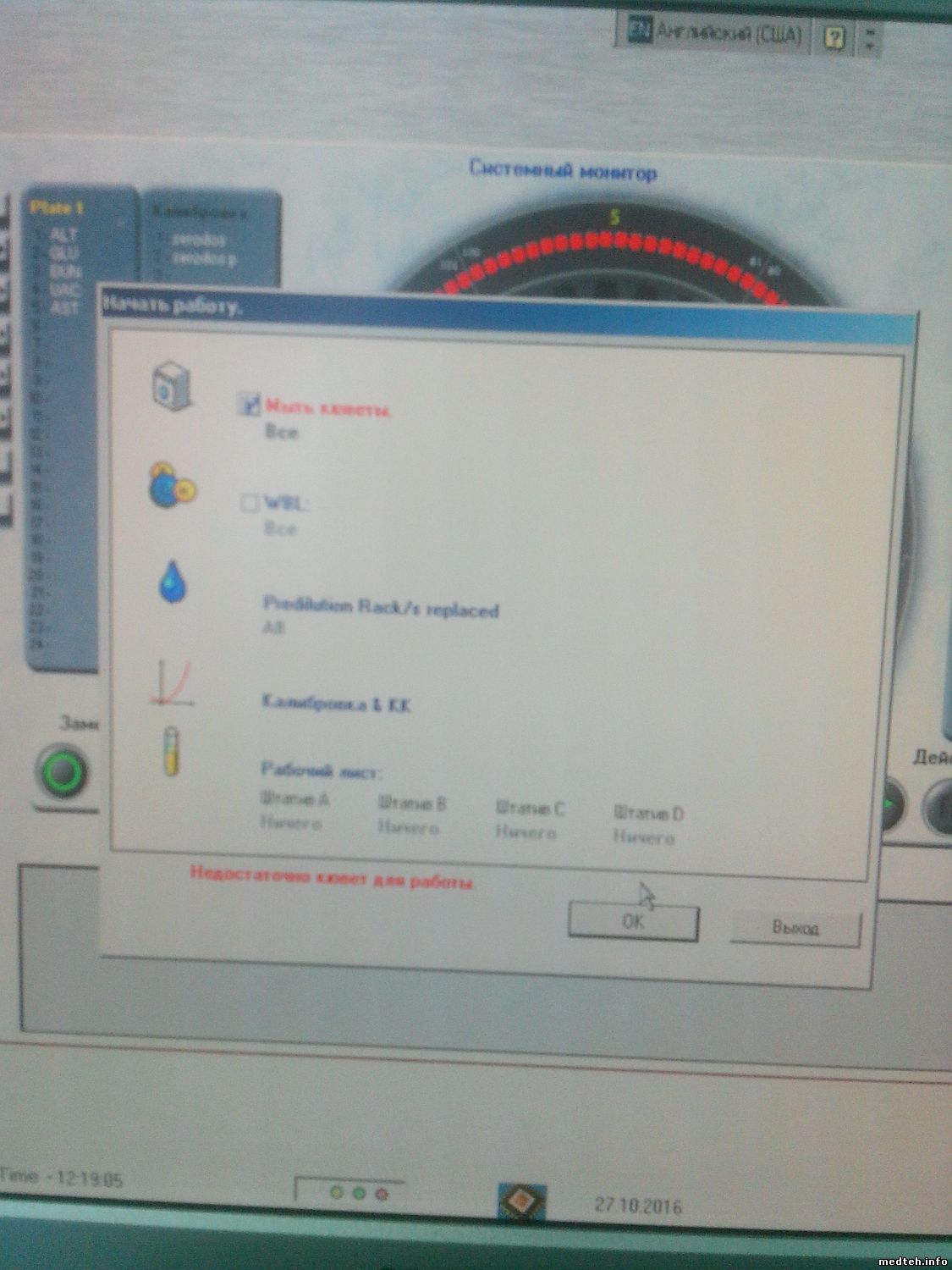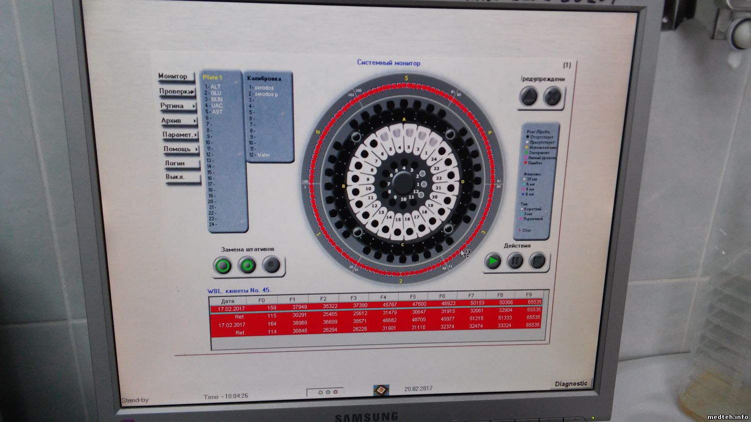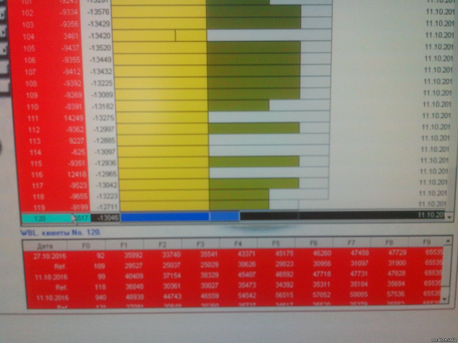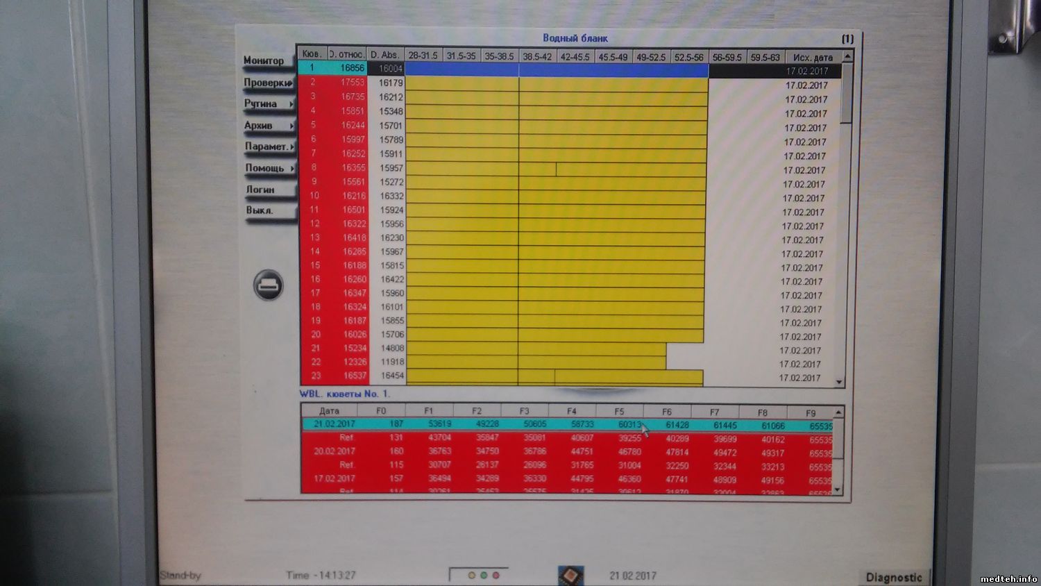 Я такого ещё не видел. Судя по картинке всё должно быть нормально, но кюветы в красной зоне. Возможные причины по вероятности (по моему мнению) 1) Игла пробоотборника забита и наливает мало или с пеной. При WBL остановить и проверить наличие жидкости в реакционных кюветах 2) Лампа на пределе и «мерцает» В диагностике проверить уровень сигнала, изменения должны быть не более чем +/- 00009 за 5 мин. (пример: 45899+/-00009) 3) «Сдохло ПО» Сохранить предыдущее и установить англоязычную версию и проверить WBL. Дальше-по результатам диагностики.