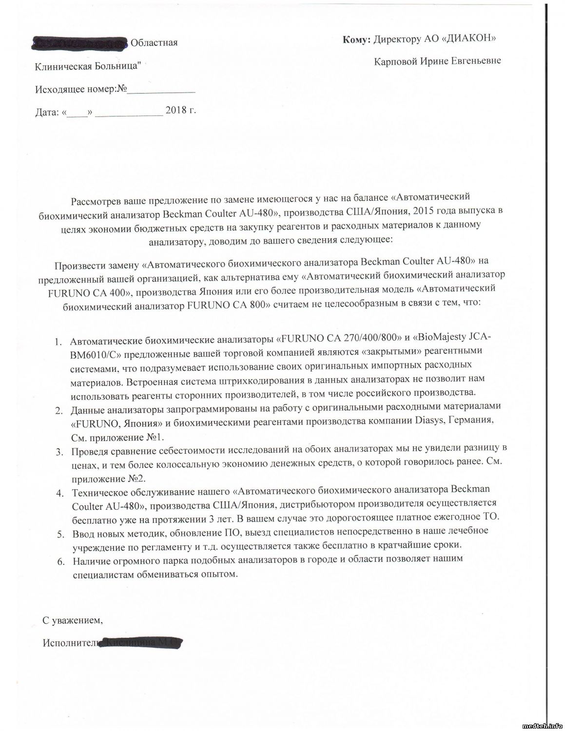 Хах...Вам поэмы писать, точно с профессией не перепутали ? Свежей инфо вы явно не владеете, если пишете, что цены на реагентику "Бекман Культер" в разы дороже диаконовских и на порядок российских. Во первых разберитесь в понятиях разы и порядок. Цены ДИАКОНОВСКОЙ реагентике куй к кую с Бекмановской. Есть прайс-лист и тех и тех на 2018 г. Только Бекмановские цены в рублях до конца года фиксированы, а ДИАКОН в у.ё. и пляшут их цены. ДИАКОН не явл. производителем реагентов для автоматов, их разливают в Пущино по баночкам, смешивая концентрированную химию DIASYS Германия с водичкой из ОКИ. Про какие отечественные реагенты вы говорите: Ольвекс, Витал...? КОНКРЕТНЕЕ)) Далее про ситуацию в регионах. У нас нет ни одного анализатора производства Бекман Культер, гематология, моча, иха, биохимия, который был бы накрыт тряпочкой. Живы и работают еще даже СИНХРОНы и Уницеллы. Да, не всегда получается своевременно что-то закупить, но мир не без добрых людей и брать в долг под честное слово никто не отменял. А занять есть у кого, парк из почти 20 машин только мне известных. Скажу больше, что в городе 2 крупных коммерческих ДЦ. Оборудование в лаборатории исключительно Бекман Культер (иха, авт. б/а), гематология Сисмекс. Вы им расскажите , как деньги считаются. А вообще, я так пониманию у вас в регионе совсем печально, перебирайтесь к нам)), у нас все хорошо.