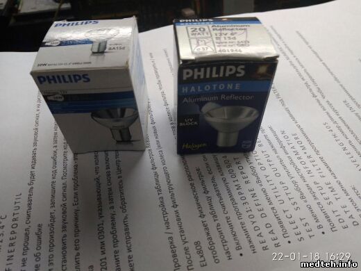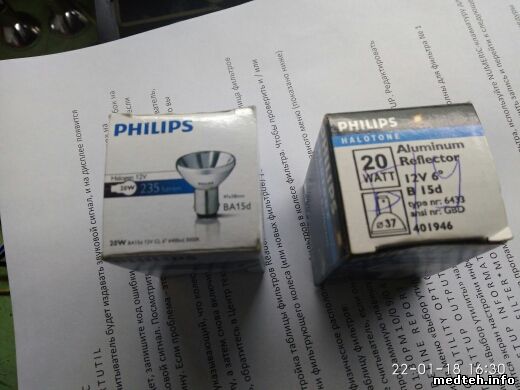 Лампа похоже на оригинальную, PHILIPS, BA15d. Halogen 12V. 20W. 235 lumen сделано в Польше. Вот только она почему то с защитным стеклом на выходе отражателя, на старых лампах стекла не было. Фильтра установлены правильно, стрелочками к фотоприемнику.