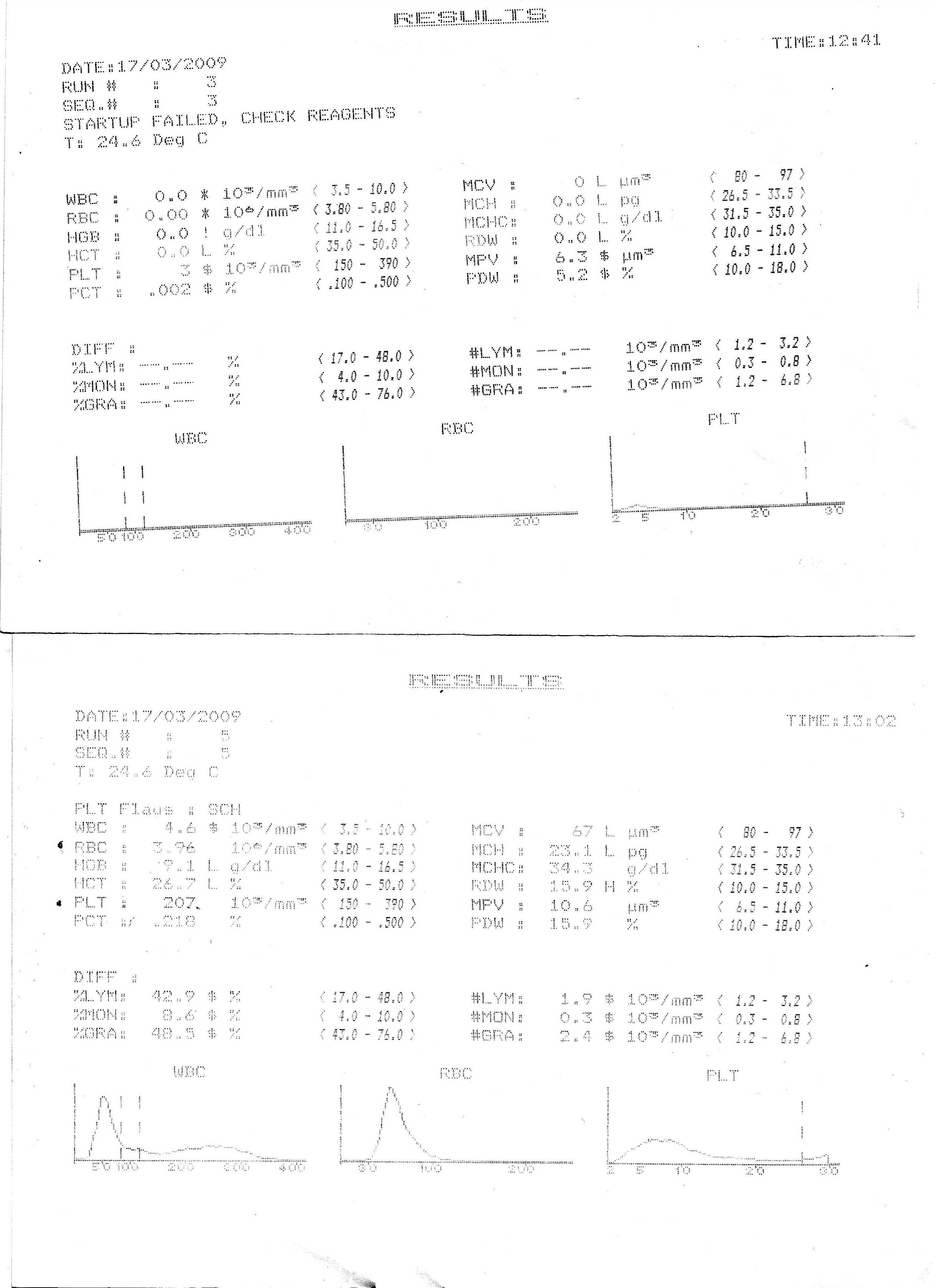 Практически никаких! Разбирать пока не стал. После промывки Парканом STARTUP начал проходить с первого раза. Последний раз прооверял вчера. Сегодня приехал на место, чтобы сделать гистограммы - и вот тебе на: не прошел STARTUP по PLT!!! Вату используют (кстати чем заменить?). Результаты в прикрепленных файлах, правда качесто не очень, принтер матричный