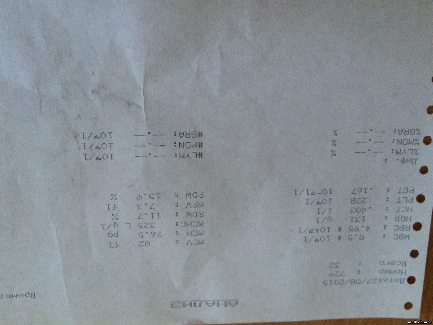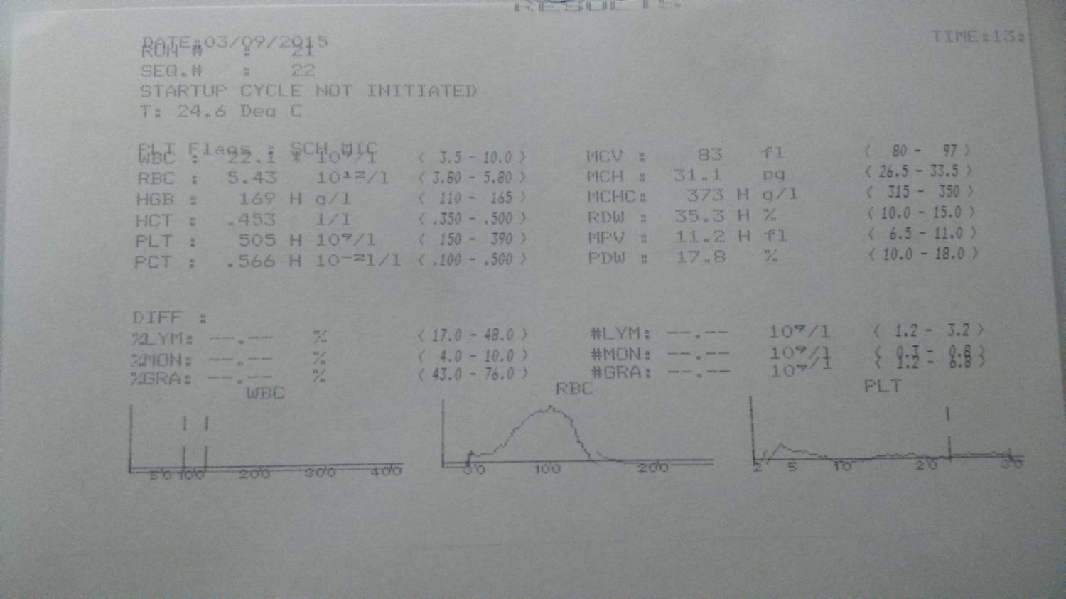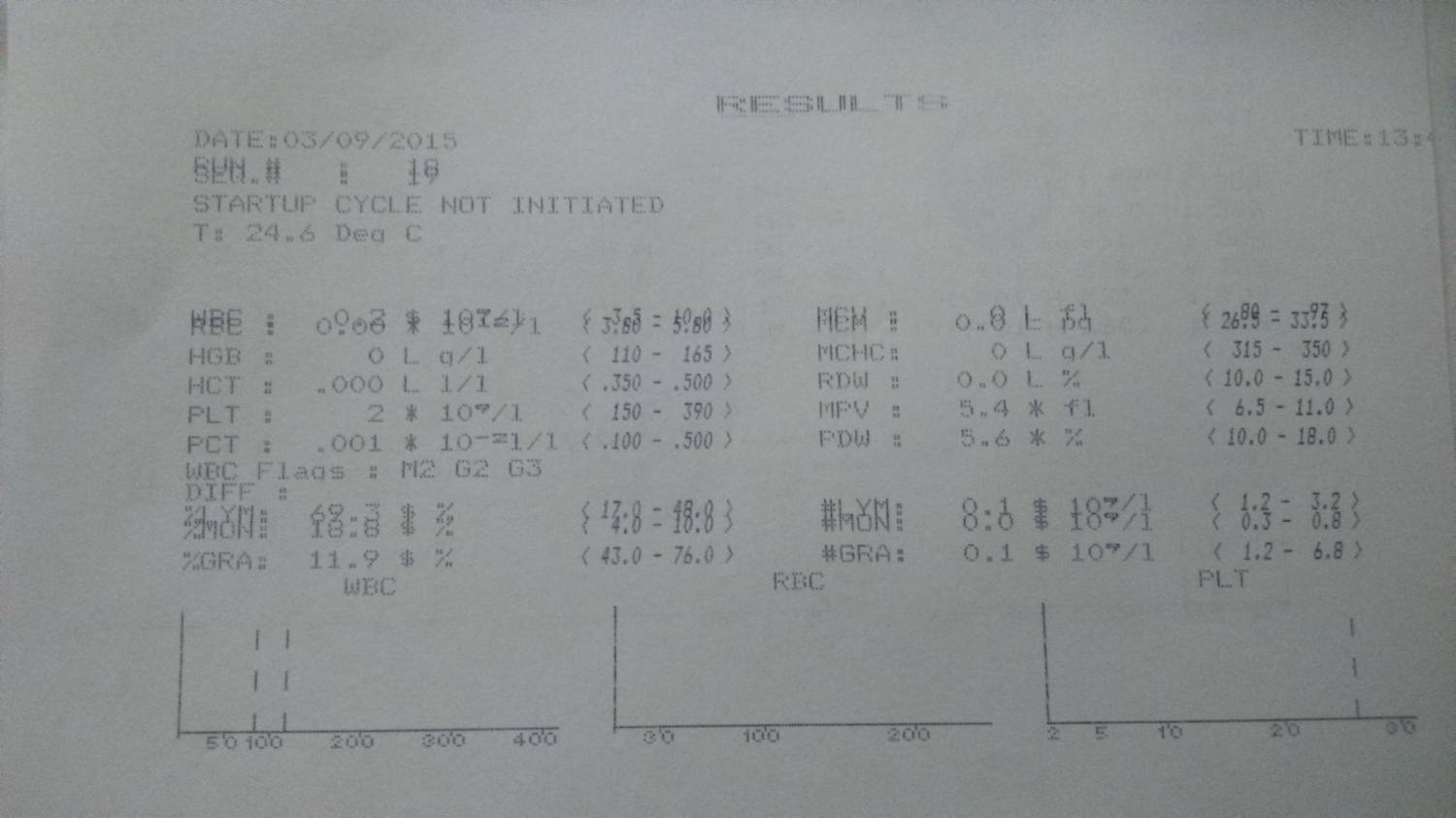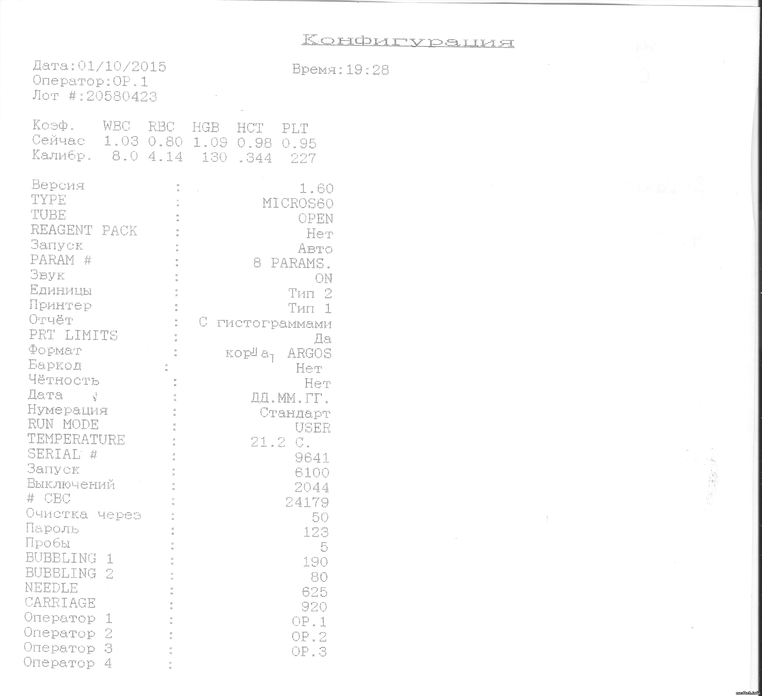 К сожалению, не нашел вкладки с возможностью переключения режимов с 8 параметров на 18. Т.ч. вопрос открыт, как сменить конфигурацию с ОТ-8 на ОТ-18 или 16 Заходил по алгоритму - 4.Сервис-> 6.Циклы-> 1. Запуск (...); 2. Выключения(...); 3. #CBC(...), других вкладок нет, дает менять значение в скобках. Далее 4.Сервис-> 7.Настройка (подошел пароль 863, другие нет)-> 1. Запуск(...); 2. Выключения(...); 3. #CBC(...), опять других вкладок нет. Хотя есть непонятное пустая вкладка - 4.Сервис-> 7.Настройка-> 9.-, при входе, экран не показывает, при нажатии любой кнопки опять выходит в раздел Настройка. Очень странно, почему в прошивке нет возможности сделать 18 параметров, т.к. во вкладках есть значения для лимфоцитов и гранулоцитов - 4.Сервис-> 7.Настройка-> 2.Adjustment-> 4.WBC Adjust ->2.#LYM (52) 3.#GRA (183). Прибор делает только 2 гистограммы RBC,PLT. Приложил принт Конфигурации прибора.