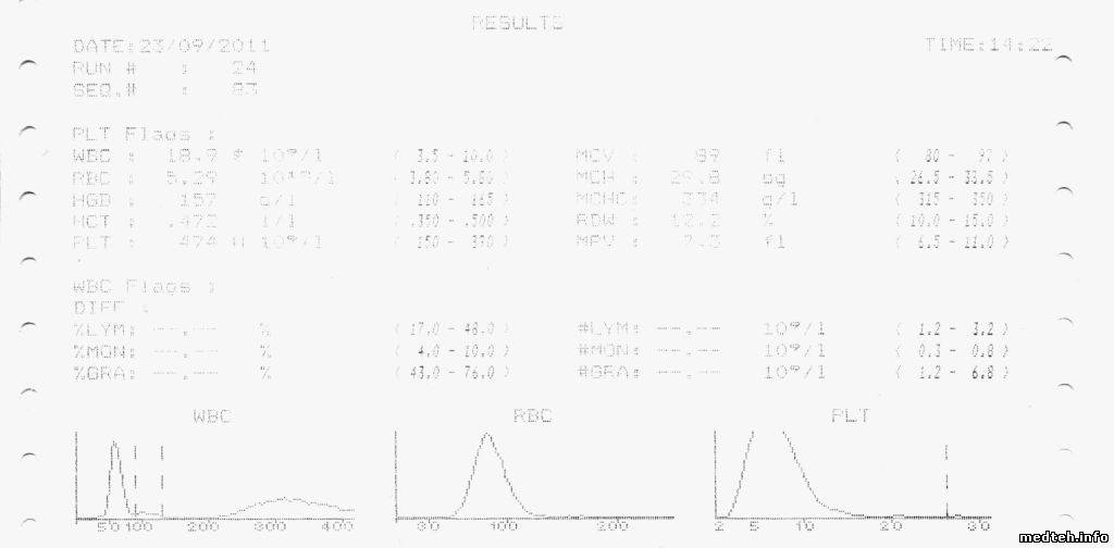 Симптомы Микроса такие: стартап проходит, но не с первого раза (первый подсчет WBC и RBC (RBC до 0,3) выше нормы, к третьему возвращаются к норме фона). При измерении пробы через раз выдает звезды и доллары. При этом графики рисует, правдоподобные, но формулу не считает. На изображении - распечатка контроля. При этом откалибровать по контрольной крови получилось, с Адвией показания сходятся.