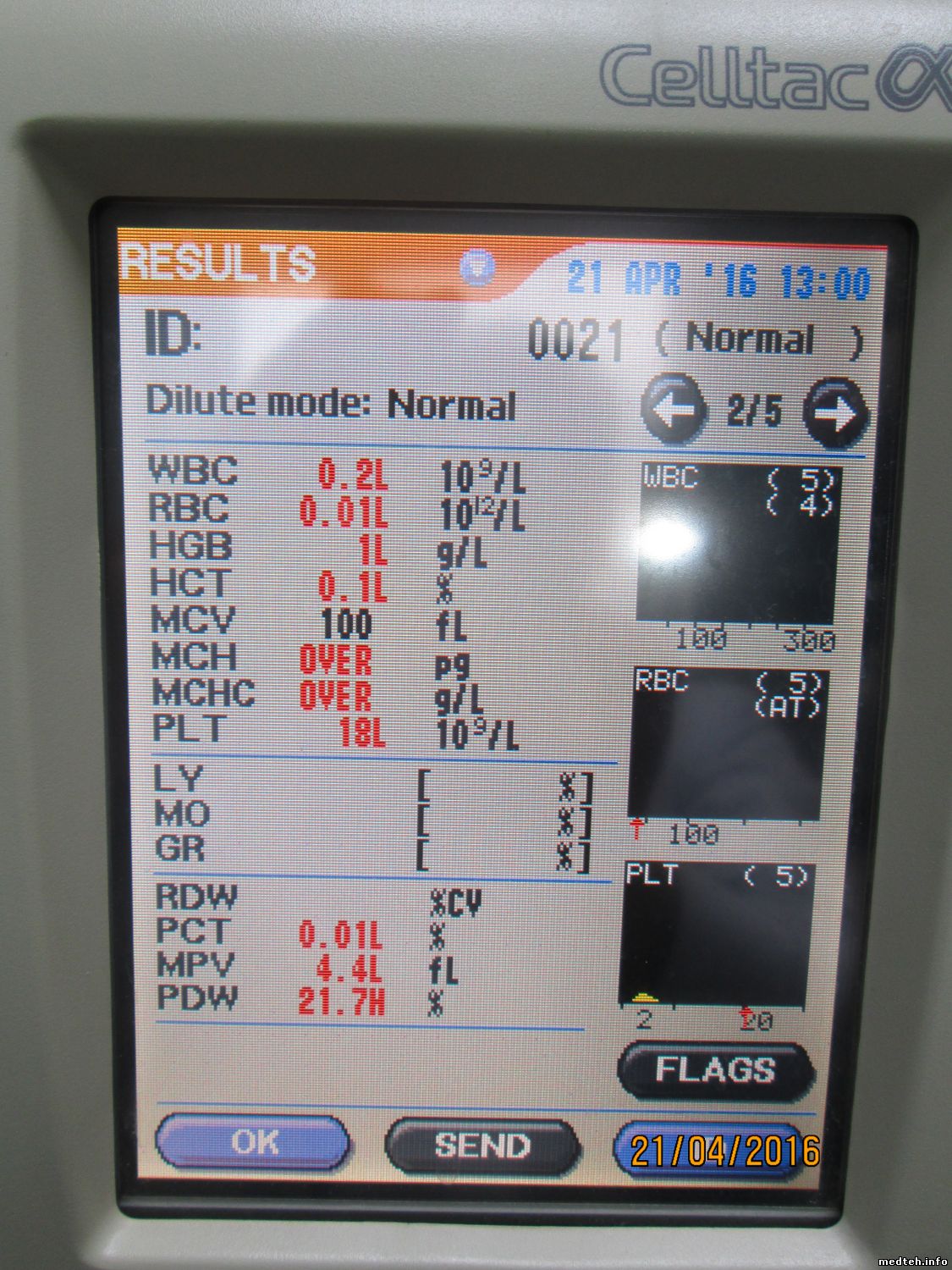 Доброго времени суток. Человеческая кровь ему не нравится по непонятной для меня причине. Идет превышение в два-три раза по WBC, LY, MO, GR. Сегодня вообще побил все рекорды, WBC вместо цифр написал OVER! Почему-то, при каждом анализе, наблюдается превышения до флагов, срабатывает тревога и тройной пересчет. Еще интересная ситуация наблюдается, если сделать пустой анализ (воздухом). Вместо, вполне логичных "0", выдает по WBC 0,1, по PLT 7. При проверке контрольной крови все просто прекрасно, аппарат показывает цифры, совпадающие с показателями сопроводительного листа контрольного препарата и/или с минимальными отклонениями в пределах нормы, что можно списать на погрешность. Сталкивался кто-нибудь с такой ситуацией? Куда глядеть, что не так, не понятно. Если есть какие-нибудь идеи по решению данной проблемы, напишите, Пожалуйста. Заранее Спасибо.