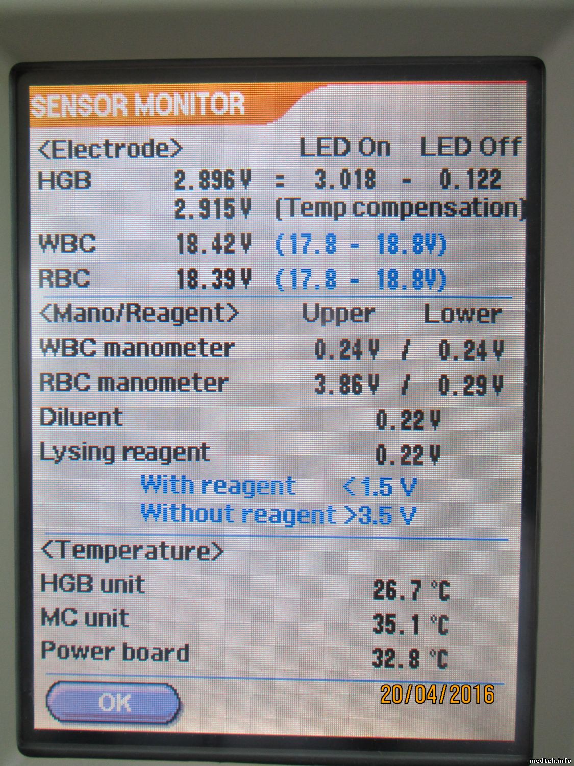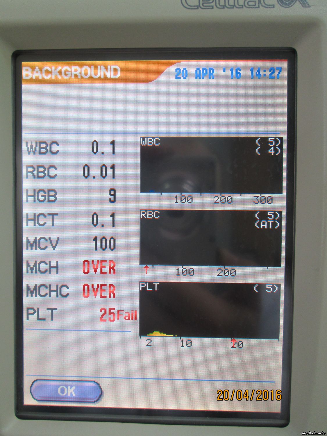 Аппарат долго не обслуживался. Реактивы Реамед. Фон не плохой, но при замере крови аппарат безбожно пищит и многократно пересчитывает и как итог завышенные в два раза лейкоциты. Как проверить работу каждого клапана отдельно? Через сервис все четко щелкают, визуально мембраны все целые. Почему на фоне MCV стабильно показывает 100 единиц?