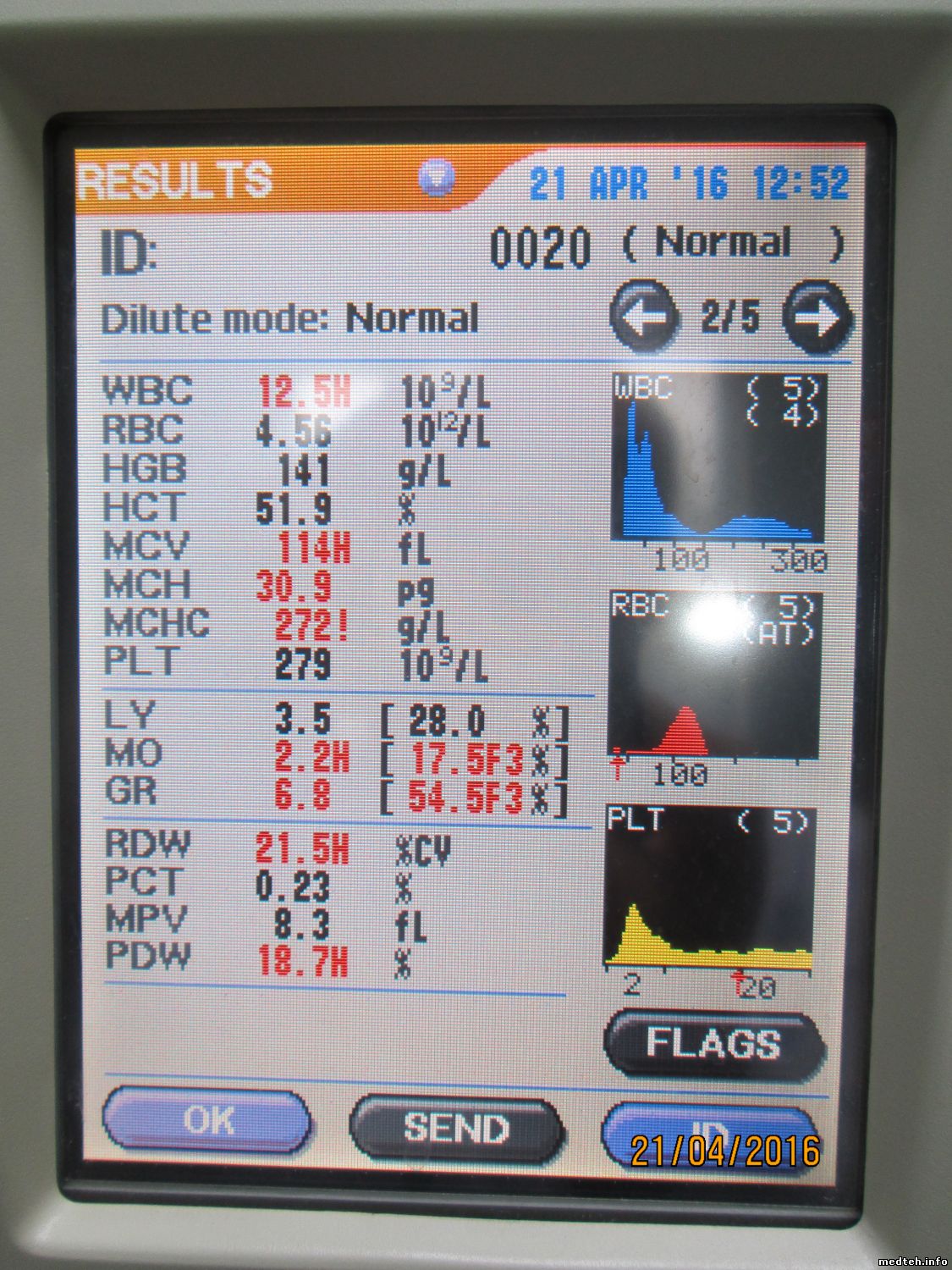 Для ipatovea. Судя по описанию (контроль — норм. Цельная кровь — много WBC) проблема с лизином. Проверятся так: При измерении цельной крови (пациента), как только игла уйдёт с левой камеры (WBC) на правую. (RBC), в камеру WBC добавить 0.5 — 0.7 мл лизина (шприцем или дозатором) . Добавлять нужно резко для лучшего перемешивания. Если результаты по WBC будут приемлемые, то причина в в качестве лизина или его подачи. Возможно засоры в паре клапанов №3 и №4 блока MD640V. Отпишись по результатам. Удачи!