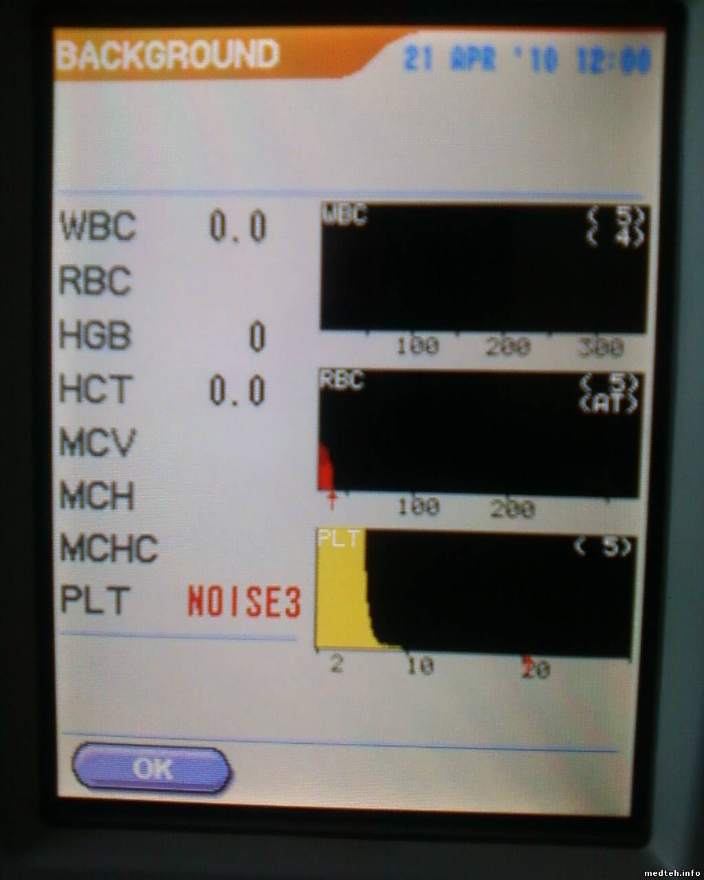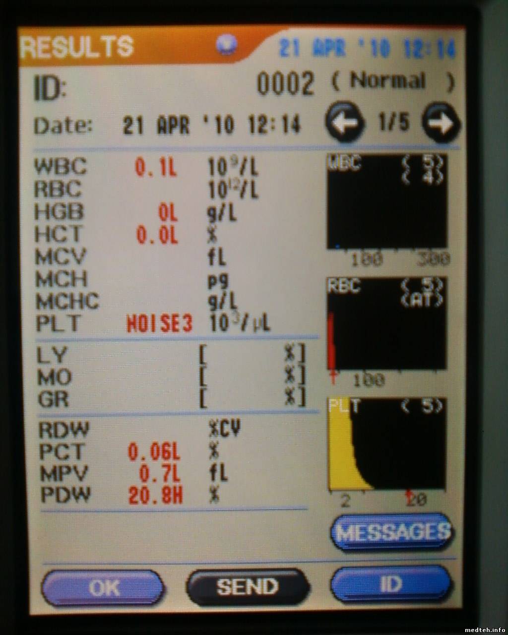 Здравствуйте! Посоветуйте, плз, абсолютному новичку куда смотреть: МЕК-6410. PLT показывает 17-19 для нормальной крови, остальные показатели соответствуют. Если замер сделать пустой (воздух вместо пробирки), то все в нулях.