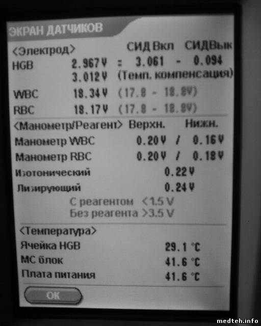 Serg74, в измерительном блоке есть две трубки (извините не знаю как правильно они называются) RBC и WBC на них по два датчика - верхний и нижний манометр. если трубка под каким -то датчиком грязная, то напряжение увеличивается. я разбирал измерительный блок, снимал плату и промывал эти трубки механически, главное их не поцарапатиь внутри. в сервисной инструкции показано как снять и разобрать измерительный блок