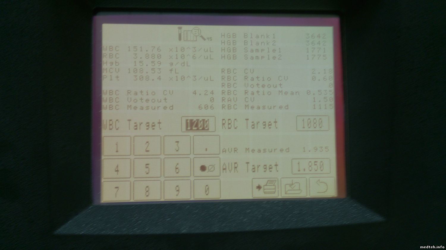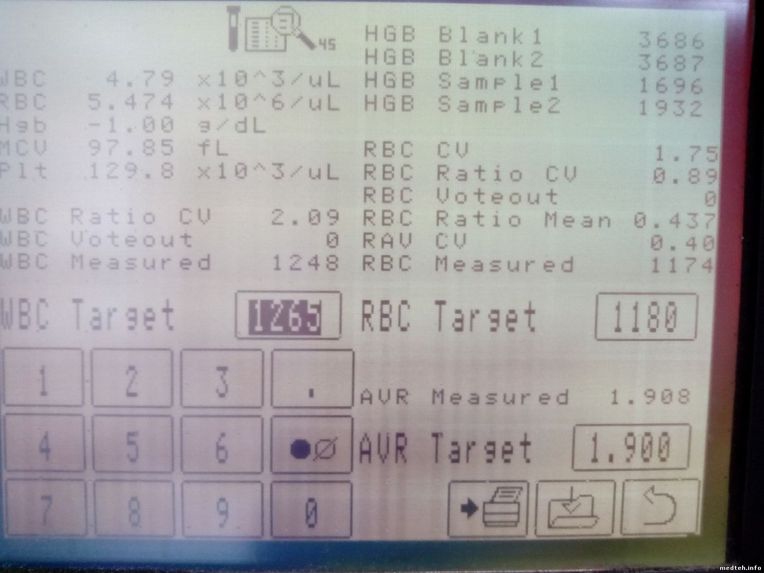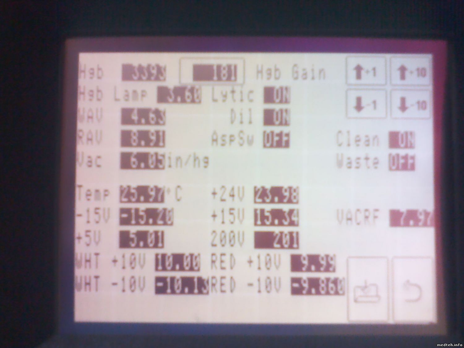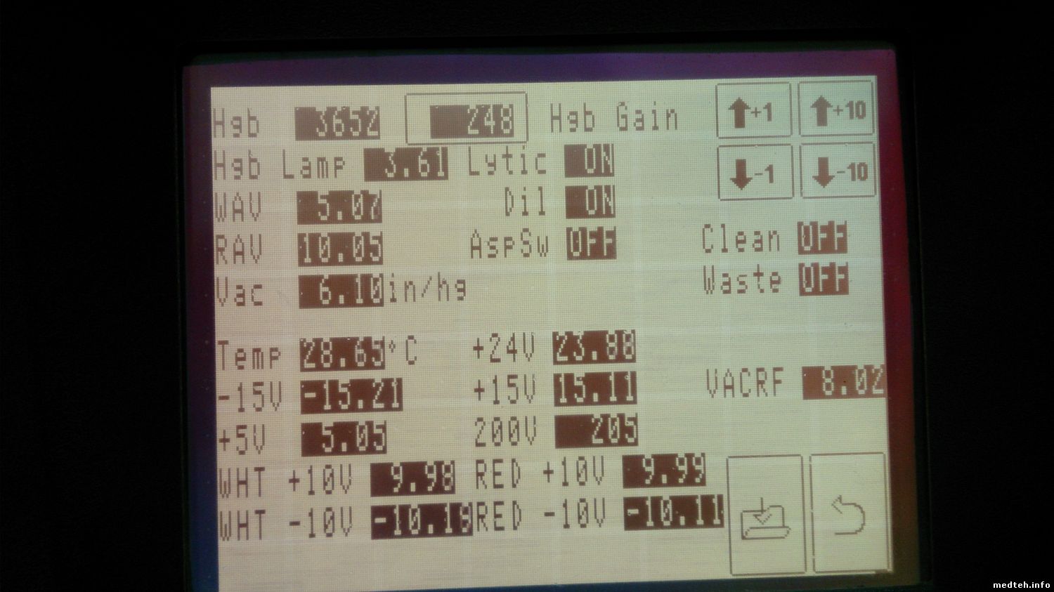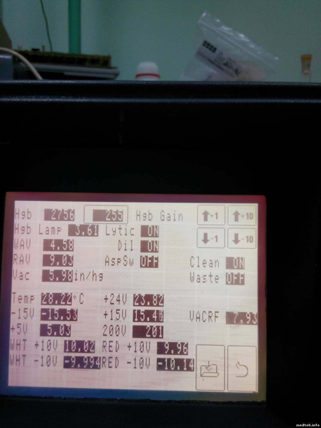 Посоветуйте направление, плз: гемоглобин в диагностическом экране -1. Значения по сэмплу в правом верхнем углу отличаются примерно на 180 ед. Замена лампы не помогла, показания фотометра не плавают, их значения и коэффициент усиления в норме..