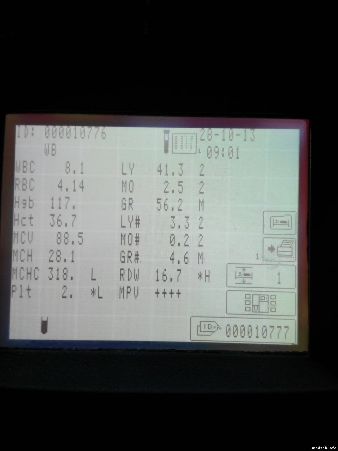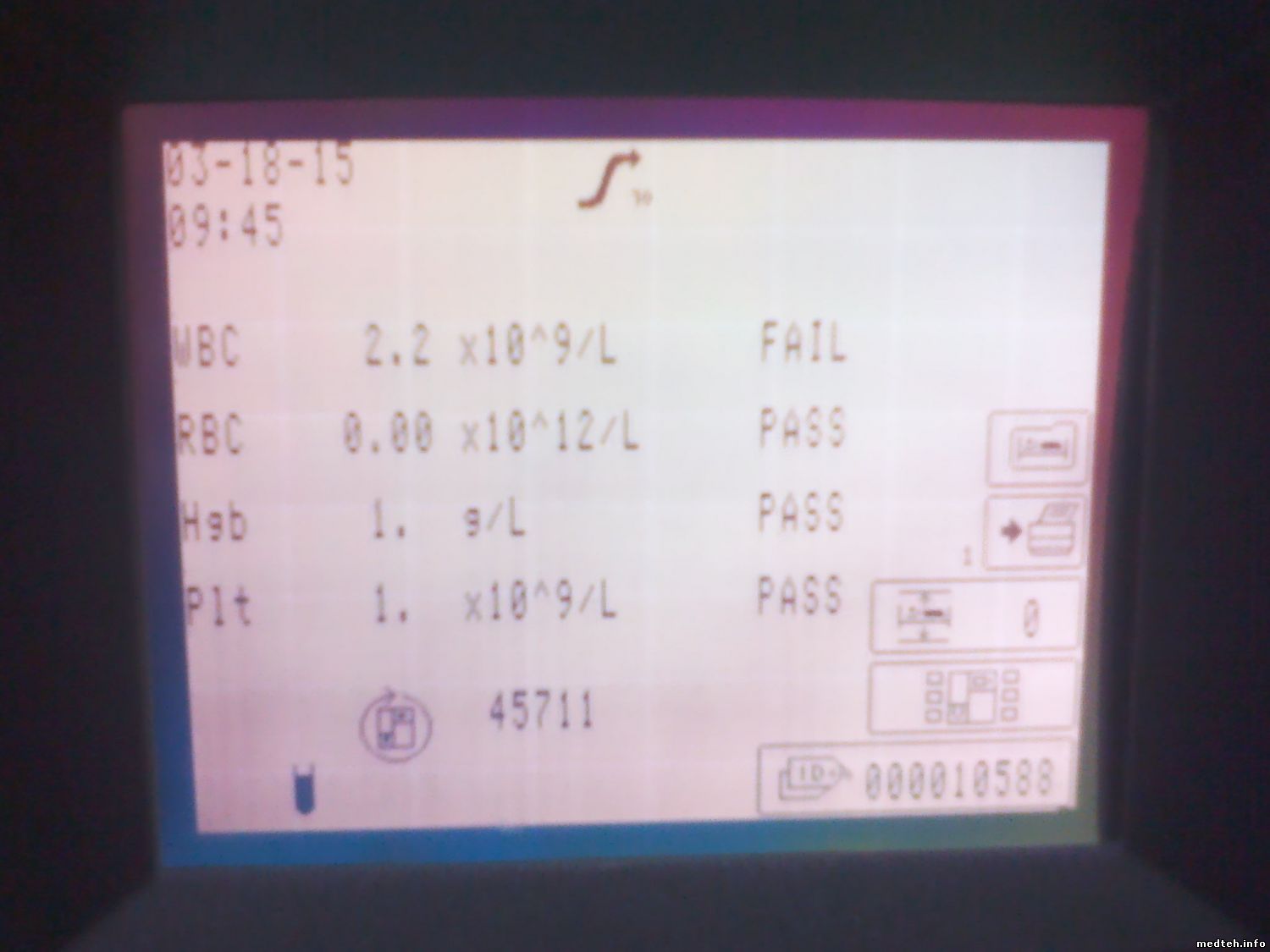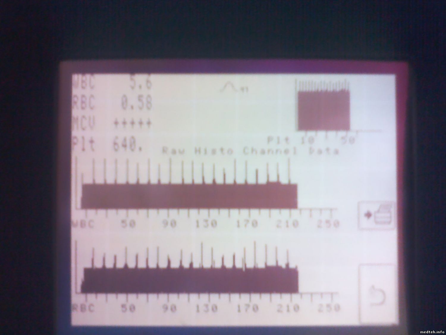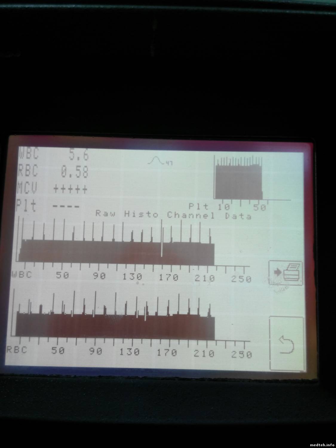 Здесь что-то другое... Аппарат стоял с начала декабря из-за отсутствия реактивов. Пару недель назад вызвали, отмочил, помыл, трубки-фильтры поменял, откалибровал - все работало. Дефект появился примерно через неделю. Любопытно, что МСНС в норме... Все цифры соответствуют контролю, кроме черточек в гемоглобине...