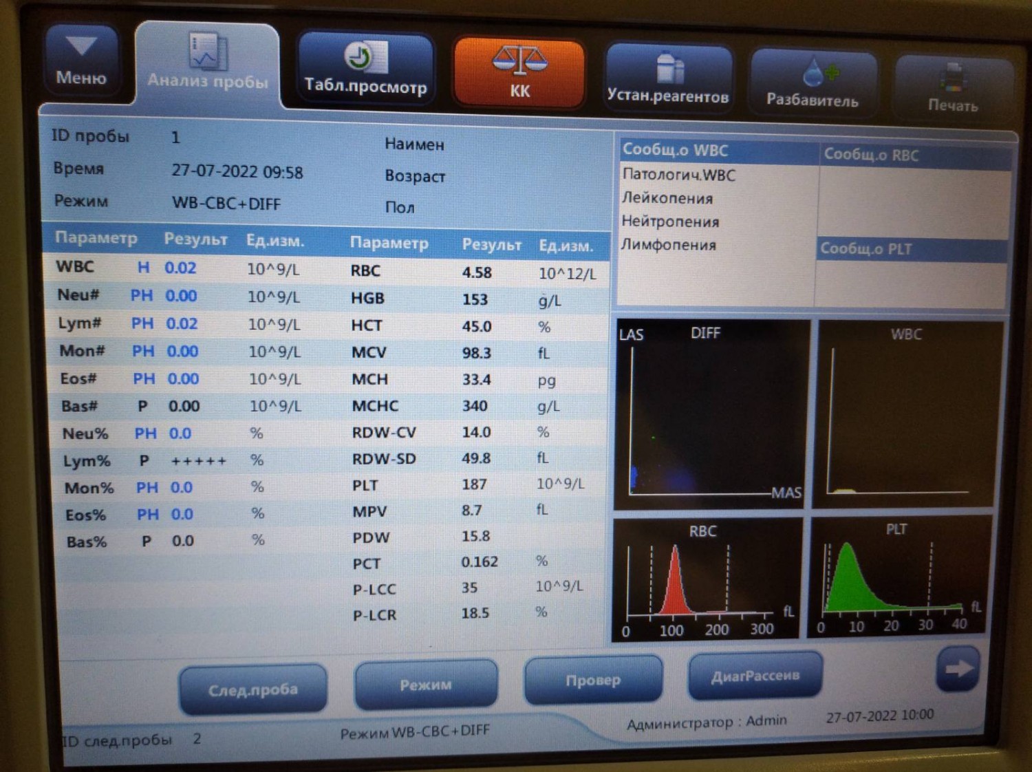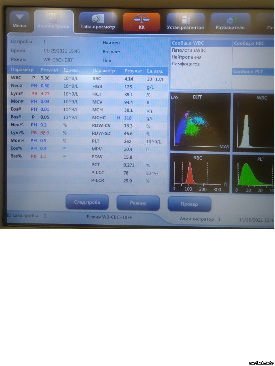 Я прошу прощения, что ввёл в некоторое заблуждение форумчан. Так получилось, что не владел всей информацией. Ситуация такая: аппарат пару месяцев назад перестал считать формулы, через несколько дней перестал отображать лейкоциты (WBC). Пытались промывать, использовать разную кровь ... Но, к сожалению, ничего. На фото результат пробы крови.