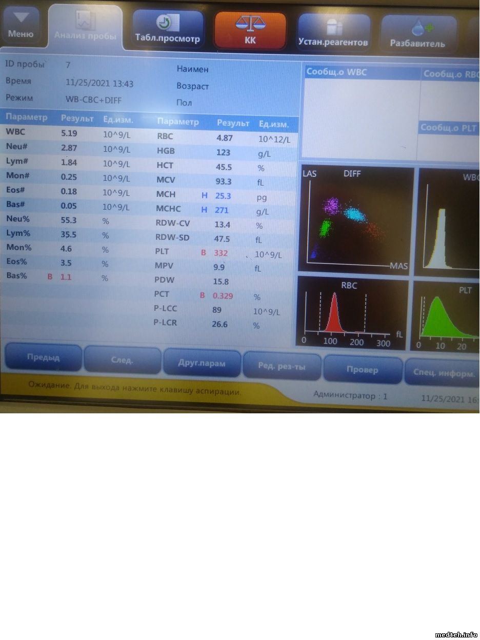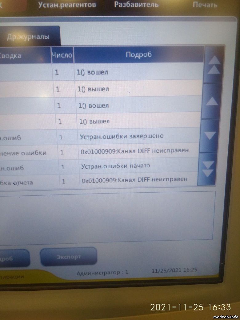 Доброго вечера. Анализатор стабильно выдает ошибку "канал DIFF неисправен(0x01000909)". Для проверки использовалась венозная человеческая кровь, измеренная на другом исправном анализаторе. Один раз анализатор выдал правильный результат(первое фото), в дальнейшем выдает результаты как на фото 2. Что делал: промывал проточку пару раз гипохлоридом, прокачивали реагенты, ячейку и лазер не касались, перекидывали клапан 16, клапана на передней стороне два верхних. Трубка клапана подачи разведенного образца живая. Может по распределению что-нибудь подскажете.