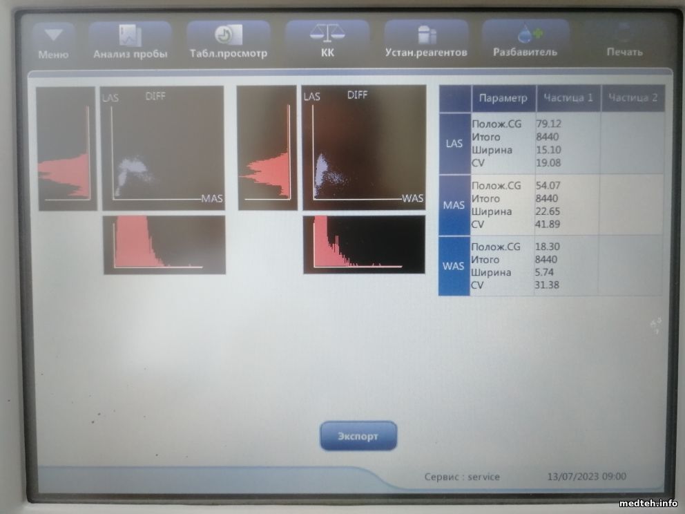 Скорее всего, проблема с проточной кюветой, возможно помыть надо. Надо проверить 16-ый клапан, разобрать его и почистить. Интересует ещё фотка о количестве событий, увидеть можно из под сервиса, и фотку в студию !Maintenance, optical debugging. Parameter Total CG Position CV LAS 1500~3000 38~45 ≤6.50 MAS 100~158 ≤3.00 WAS 100~200 ≤8.00 Эти данные даны для спецлатекса, не стремись к показаниям ... Просто выложи фото обычной крови. Теперь по промывке проточки: смотри 9-ый пост, там кратко приводятся самые оптимальные действия. И со временем ничего не поменялось, по-прежнему я мою так ...