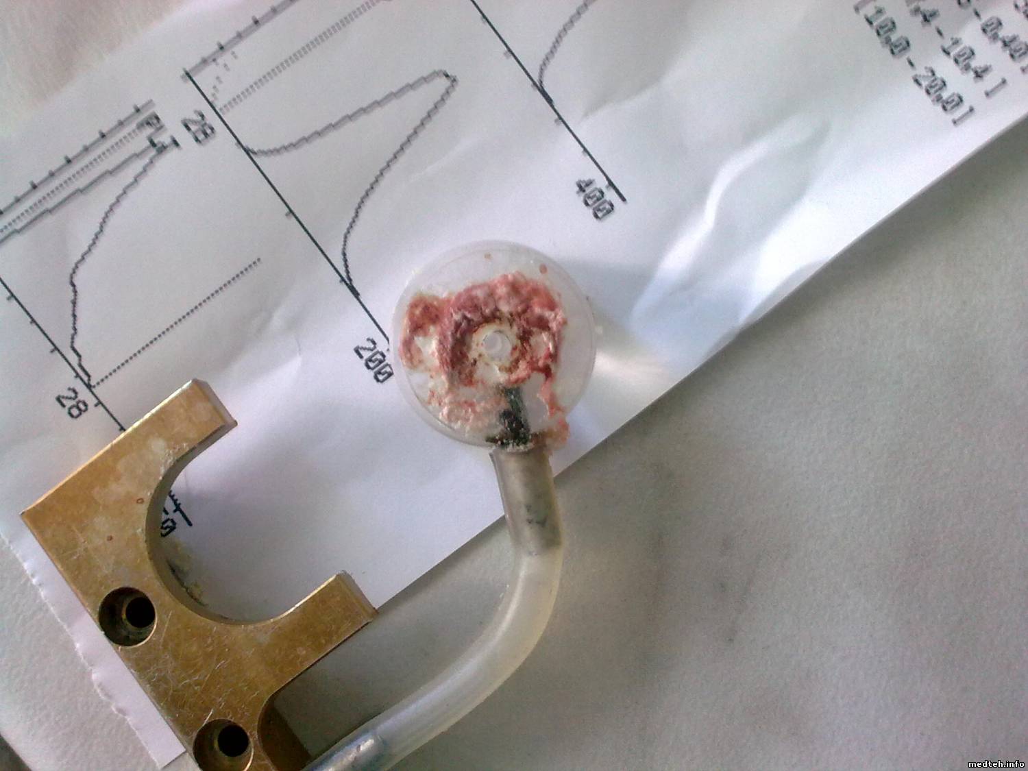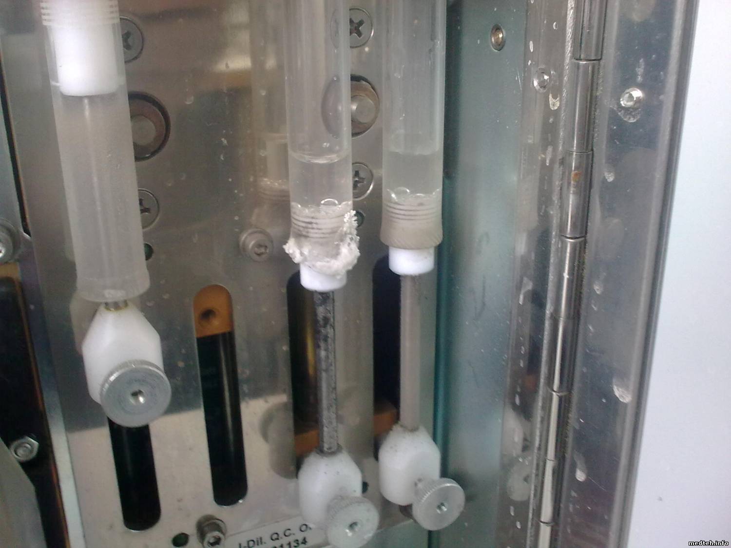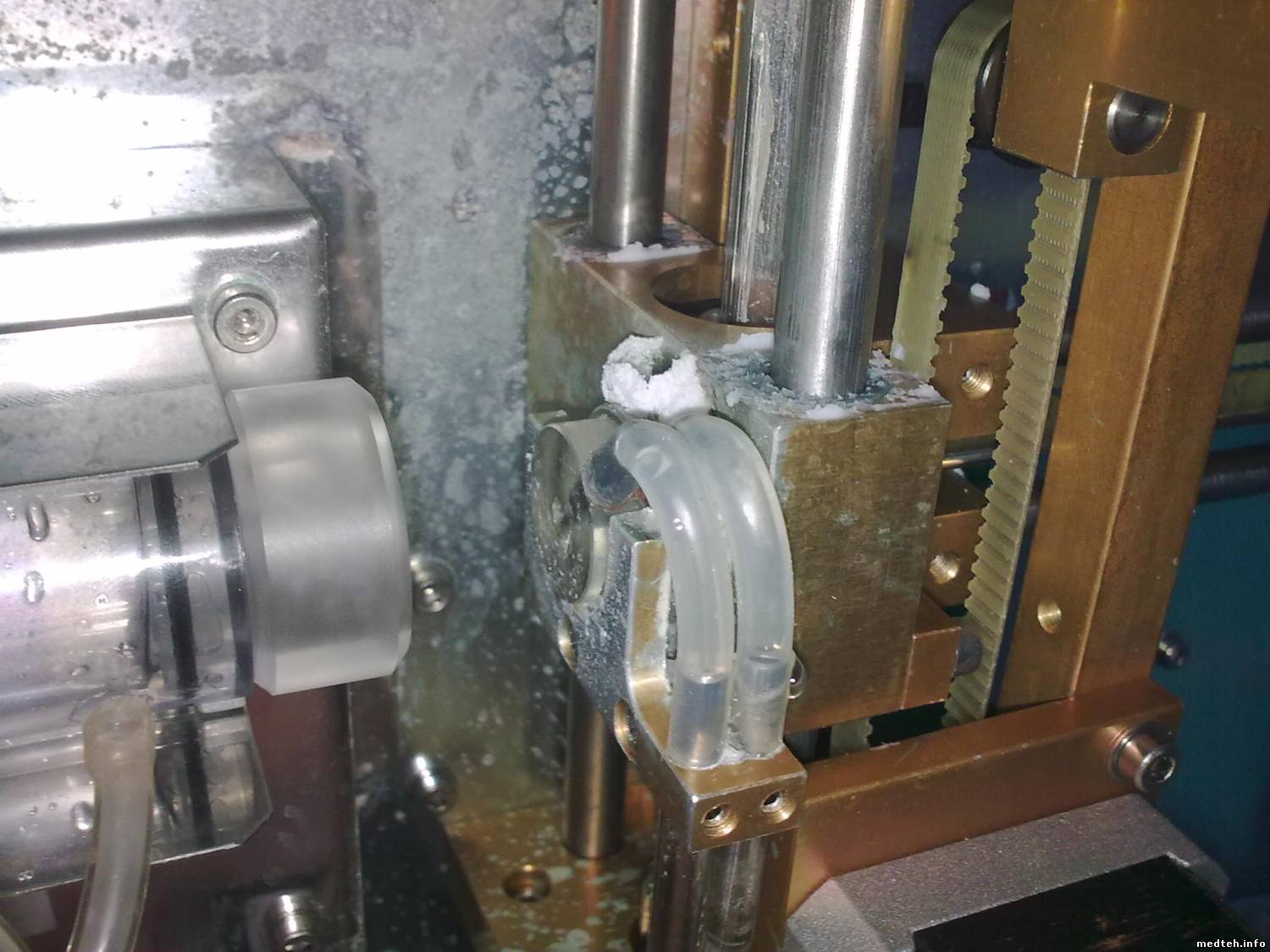 Bardey, по поводу солей - сегодня столкнулся с еще одним Джуниором из той же партии (2004 год) правда я его перебирал месяца три назад, начали работать на реамеде - помутнели трубки - 1 фото, на второй моющая головка - причина отложения солей - трубки теряют эластичность и в районе металлических штуцеров начинают подтекать, так как подтек незначительный все постепенно высыхает и увеличивается в размере, затем кусками отваливается и падает в камеру, снаружи не видно но пока не размоется кусок, очень сильно завышают тромбоциты. Выход - подбор подходящих трубок, только надо учесть что в одной(которая на откачку) стоит ограничитель, его надо переставить. А так, в принципе в пользовательской указано, что головку надо протирать раз в неделю, но, кто ж это будет делать.