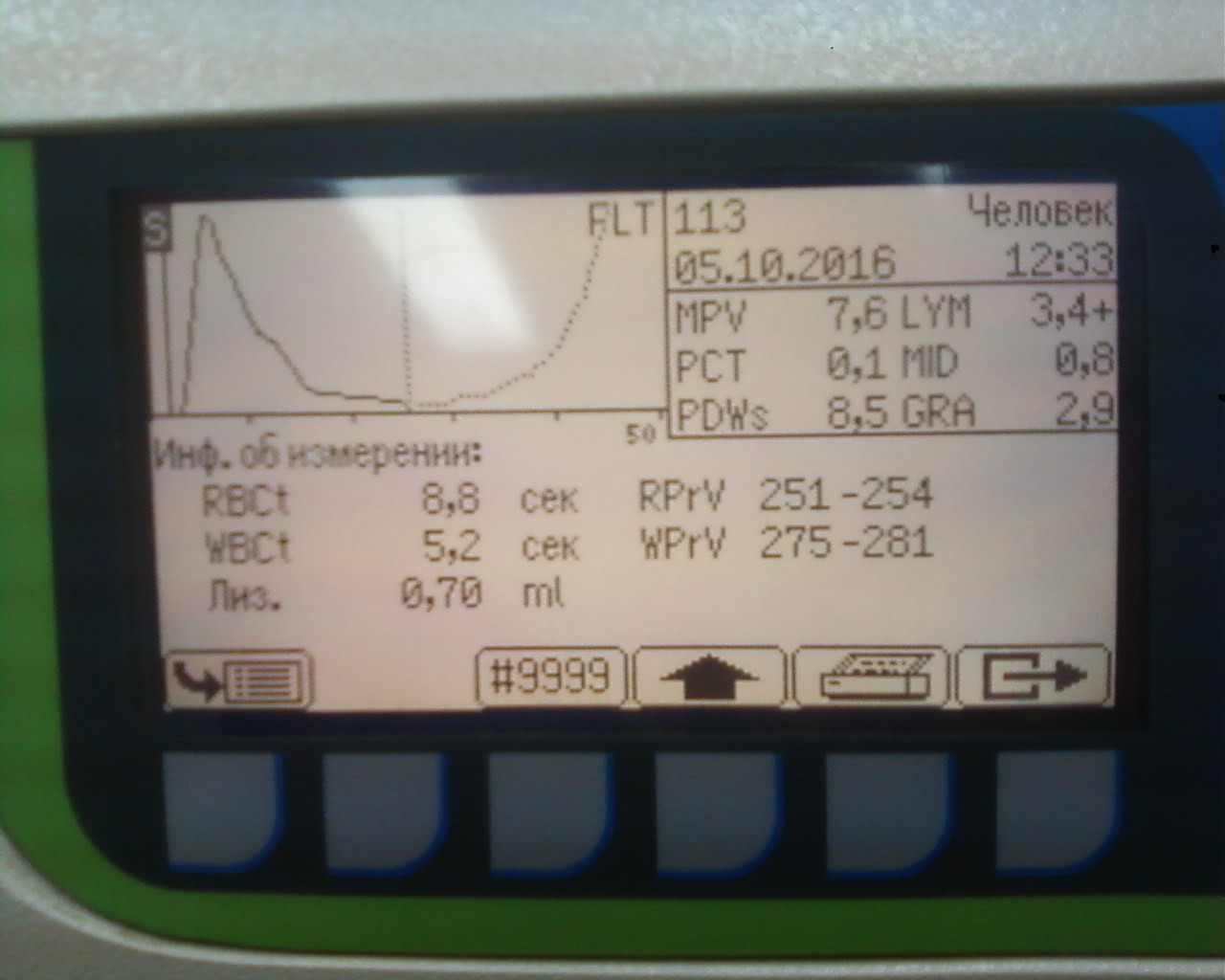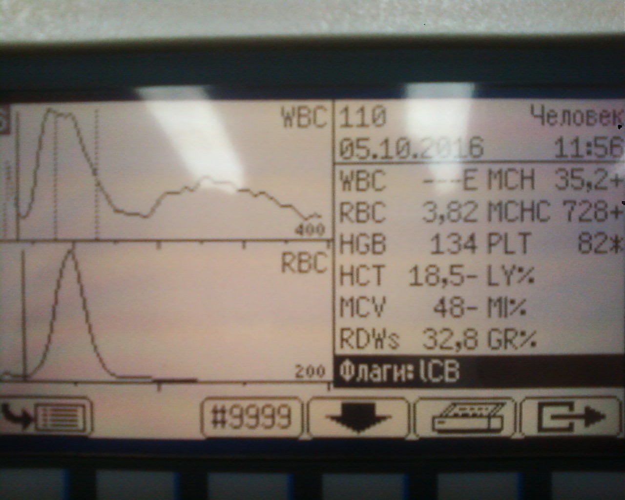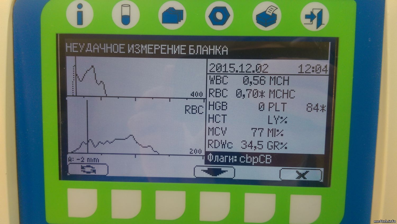 коллеги- подскажите светлую мысль. ситуация такая - Abacus Junior среди дня стал выдавать значительное превышение по wbc -гистограмма с масимума шкалы сначала монотонно снижалась до трети шкалы без всяких пиков, гемоглобин на 20% выше нормы а rbc и его гистограмма укладывается в норму. так на разных пробах. бланк при этом отличный, без фона. Менял лизин- не помогает, пробовал на капиллярной крови с гепарином - гистограмма также не правильна- максимум вначале и экспоненциальный спуск до нуля. При этом контрольная кровь показывает стандартную гистограмму и все параметры в норме!! камеру и апертуру мыл гипохлоритом нет результата. давление (650) и вакуум (363) в норме такое ощущение что не происходит лизирования, но как на разных не просроченных реактивах (пробирки тоже родные с ЕДТА)