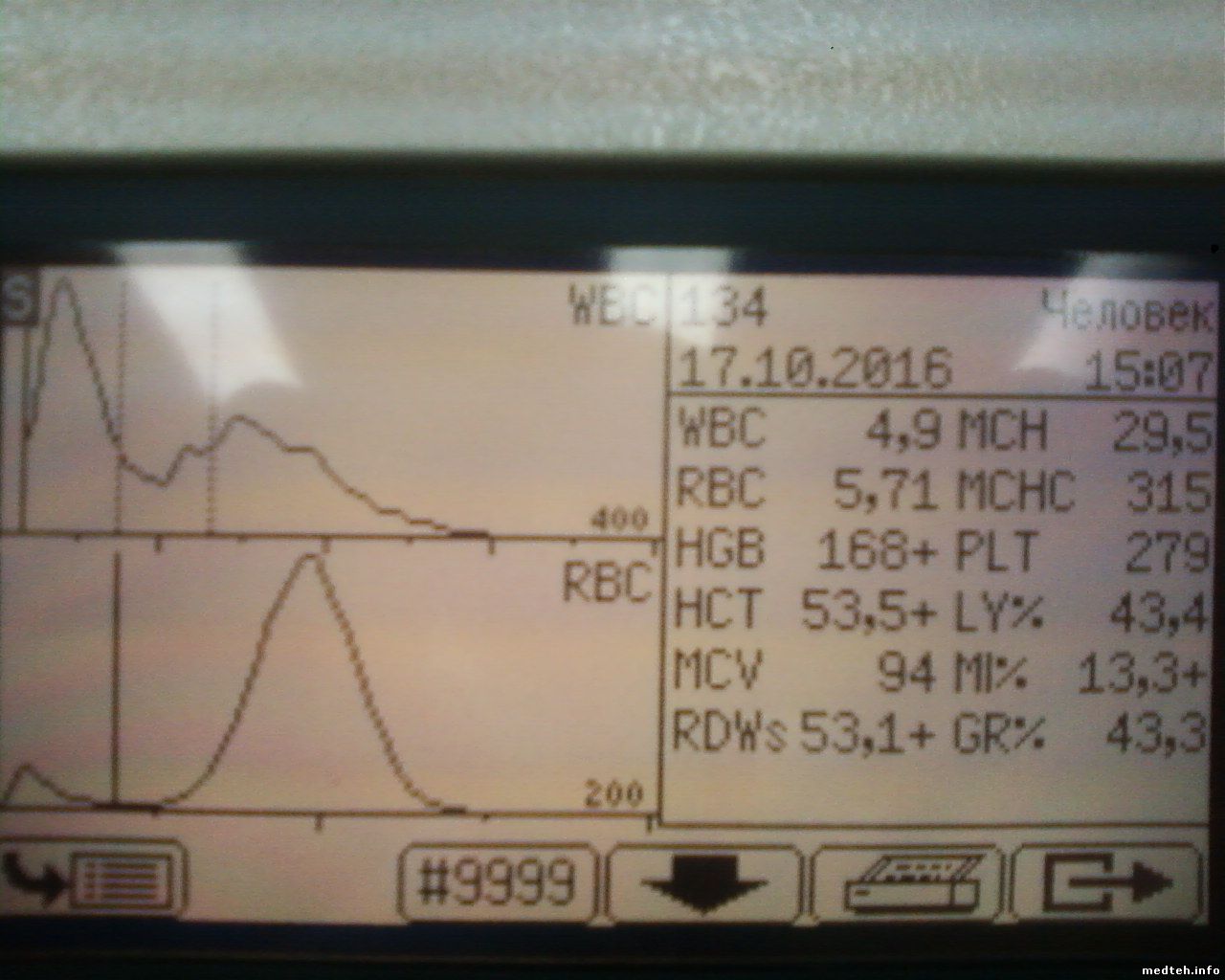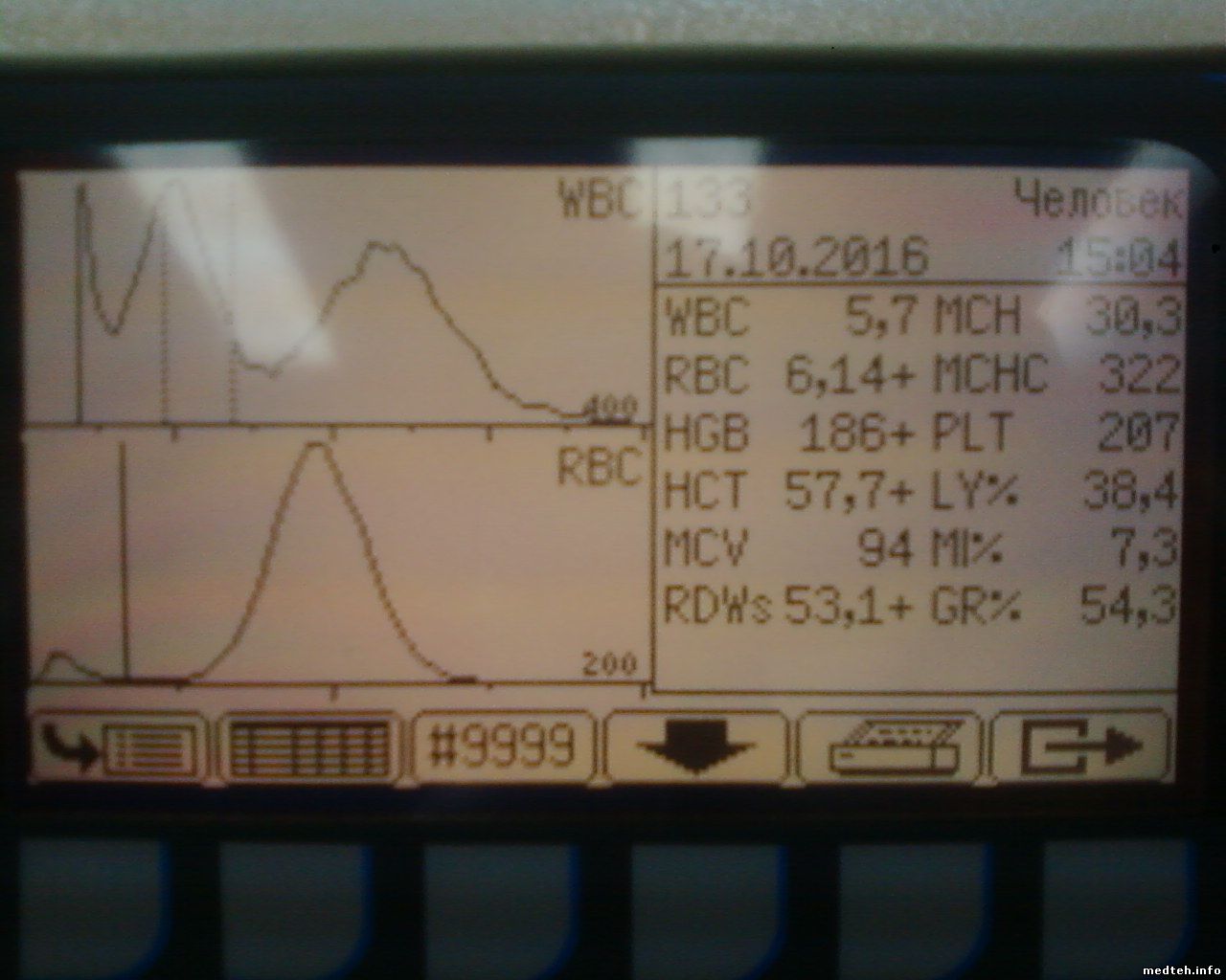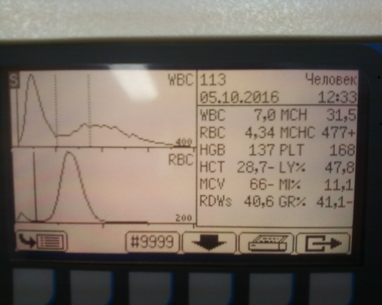 коллеги- подскажите светлую мысль. ситуация такая - Abacus Junior среди дня стал выдавать значительное превышение по wbc -гистограмма с масимума шкалы сначала монотонно снижалась до трети шкалы без всяких пиков, гемоглобин на 20% выше нормы а rbc и его гистограмма укладывается в норму. так на разных пробах. бланк при этом отличный, без фона. Менял лизин- не помогает, пробовал на капиллярной крови с гепарином - гистограмма также не правильна- максимум вначале и экспоненциальный спуск до нуля. При этом контрольная кровь показывает стандартную гистограмму и все параметры в норме!! камеру и апертуру мыл гипохлоритом нет результата. давление (650) и вакуум (363) в норме такое ощущение что не происходит лизирования, но как на разных не просроченных реактивах (пробирки тоже родные с ЕДТА)