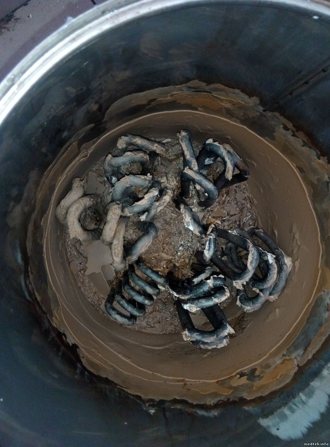 И вот прошло 4-е месяца и звонок от ст.мс - мол перестал течь дистиллят и наш электрик посмотрел, по-моему выгорели ТЭНы Моя реакция в трубку Приехал - сразу начали с того, что мол да ну - если они новые были, чего-то это им гореть? Ага... Спрашиваю козу - воду сливаешь? Она - да, регулярно! Ладно, а чо было - а было, говорит, работает он а потом как начал гудеть аки трактор и дистиллят чОрный пошел. Да уж... Снимаю шустро патрубки, кладу в сборе на бок, не сливая с холодильника воду. Сразу же начался ливень из рыже-оранжевой воды... Короче - ведро г-на вытекло в ведро и на пол. Достал бочок - 4-е тена выгорели. Благо пару оставил в резерв и два взял новых. Трубка уровнителя заросла полностью... Опять спрашиваю козу - воду то сливала или нет? ну... не всегда получалось... Но сливала... Да ни-ра ты не сливала - тут даже трубку забило намертво!
