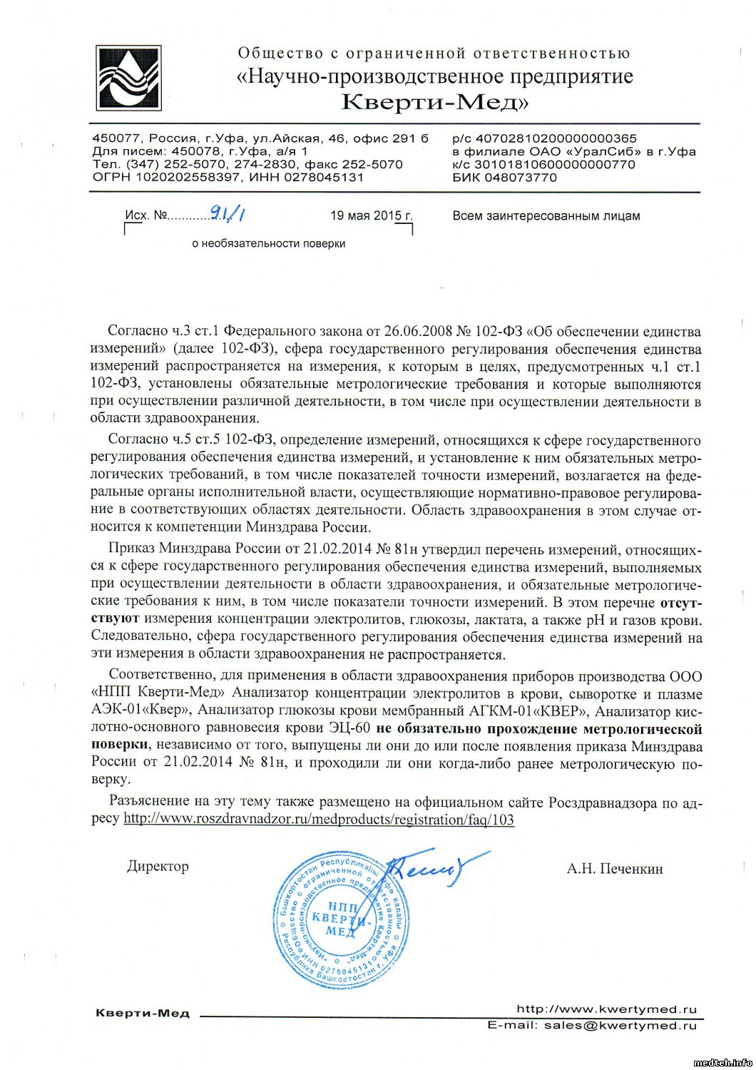 Для тестирования сам взял ёмкость из под калибратора, потом уже лаборанты сказали, что там вода. В ответ на запрос по поводу поверки АЭК-01 из сервиса прислали мне скан официального письма о необязательности поверки, выложу тут, может кому пригодится (надеюсь, "Кверти-мед" не против).