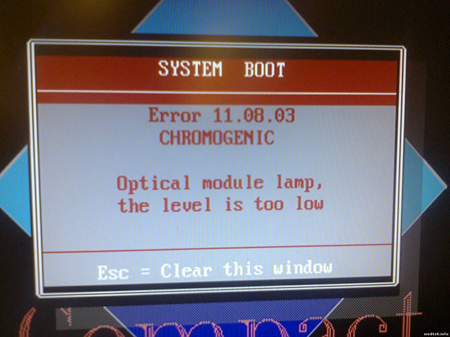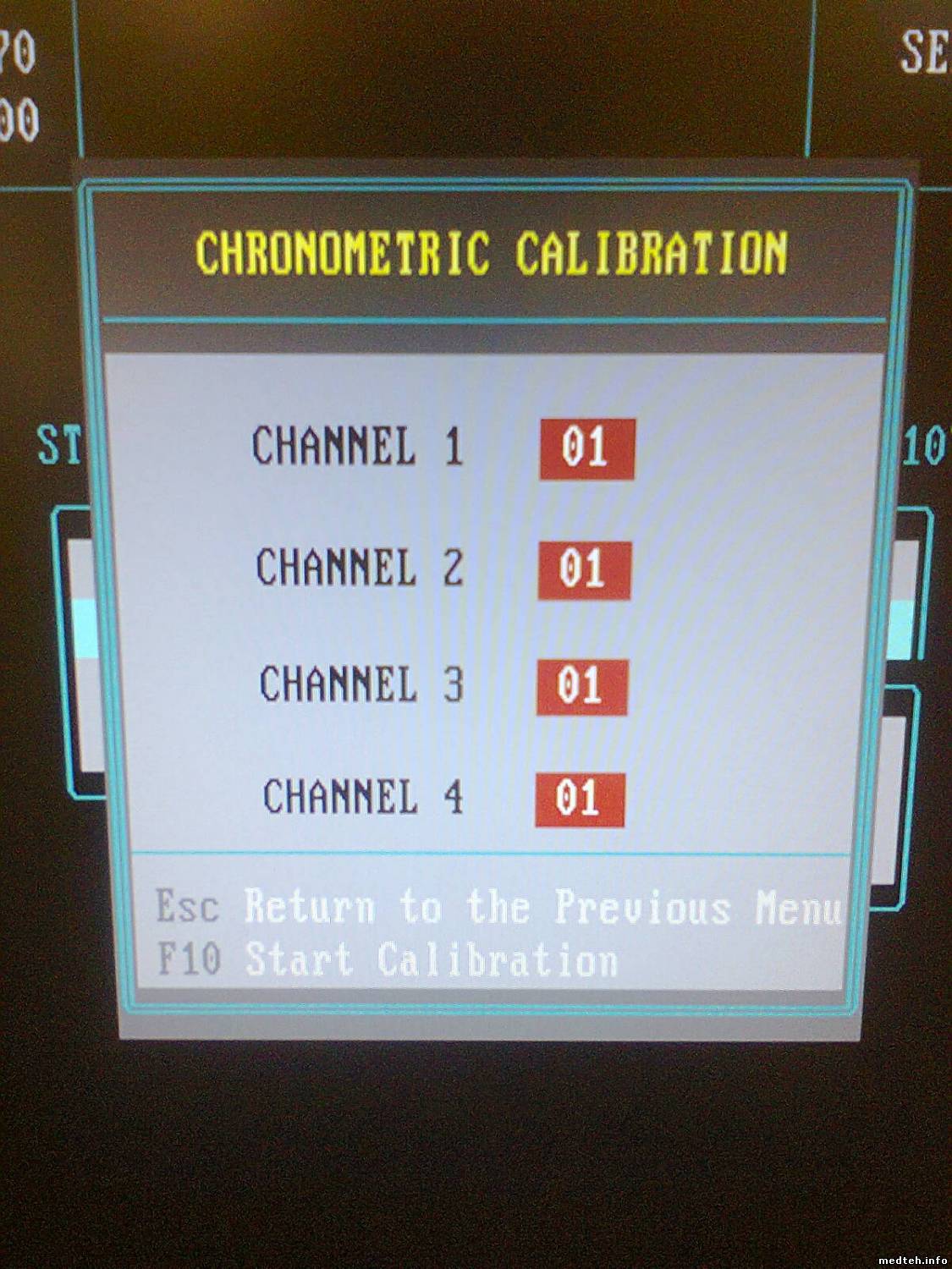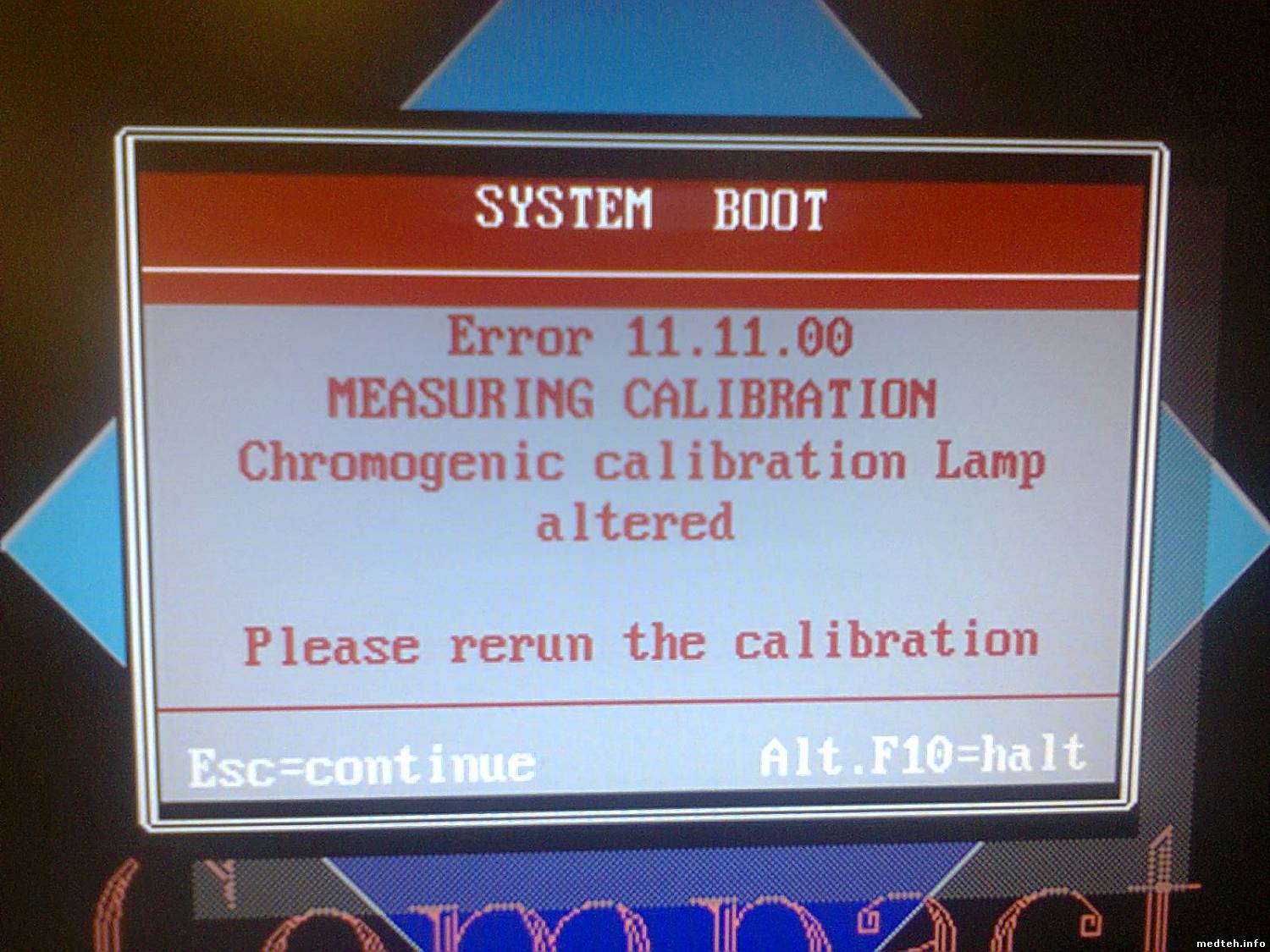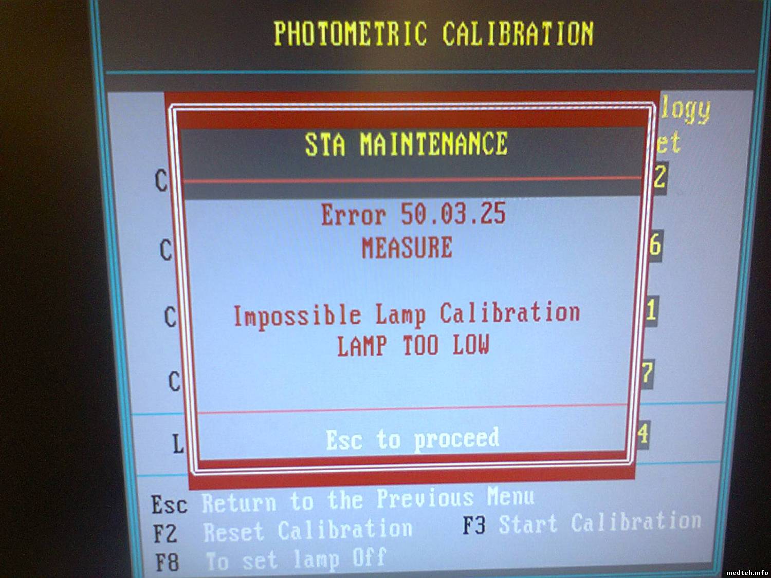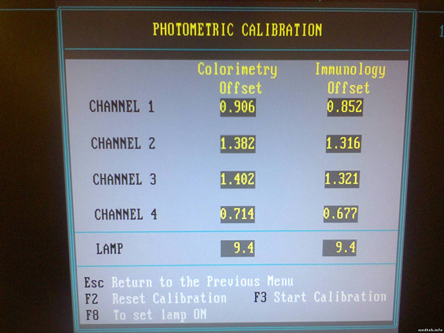 Требуется настройка усиления лампы из сервисного меню. - Access the "Service Maintenance" menu, "Measurement and Temperature" sub-menu, - Choose the option "Calibration" then "Photometry", - Press the F3 key to "Start Calibration", - Tape 0 to run the calibration of the 4 measurement channels together, - Place 4 cuvettes filled with 300ml of distilled water, into the 4 measurement cells then confirm with the key. - After calibration, check the offset values: 0.2 OD < colorimetry offset < 1.5 OD 0.2 OD < immunology offset < 1.5 OD