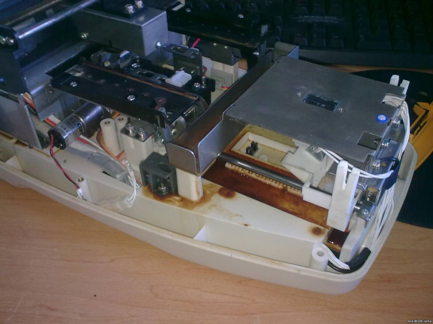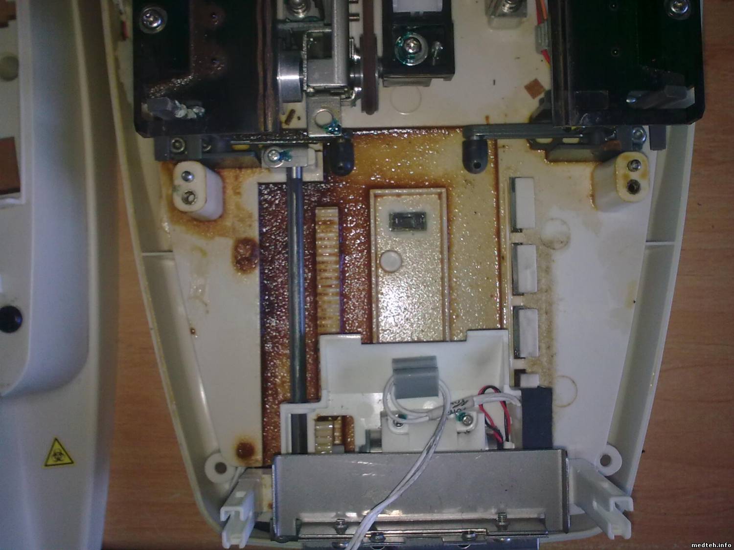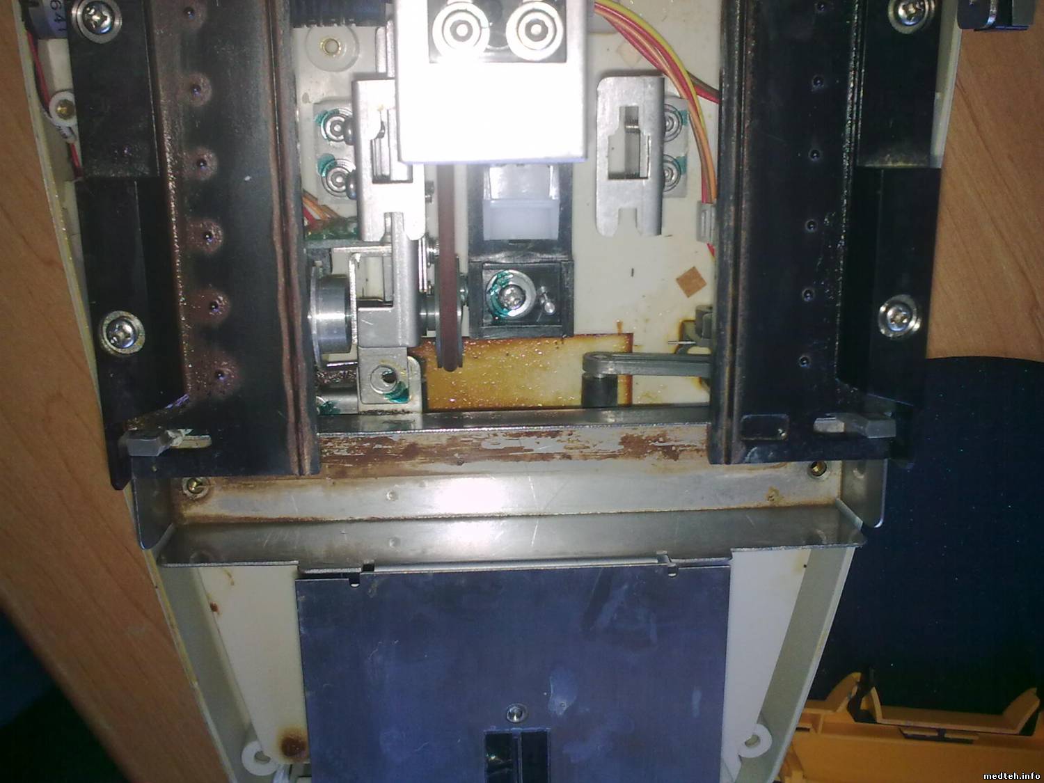 babysh-m, понаблюдай движение полосок при открытой крышке, тоже не раз сталкивался с этой ошибкой, при перекладывании полоска смещается вправо или влево с каждым шагом, соответственно черная метка уходит из контрольной зоны. Как мне кажется все возникает из-за двух составляющих - износ и не совсем нежные руки наших врачиков, так как узел снимается для промывки, и при обратной сборке вставляется с излишним усилием. А иногда роняют сам элемент с перемещающими планками, вплоть до изгиба. Еще одно место это центрующие лапки, если плохо двигаются(выработка или грязь), то полоска также смещается изначально в какую-либо сторону. Кстати у меня на одном приборе уже появилась новая проблема - лопнула (в районе крепления) поджимающая планка, эта та, в которую упирается подвижный столик, и которая в свою очередь двигает фиксирующие полоску(при измерении) лапки. Пока вышли из положения вырезав из такой же стали полоску и пропаяли по всей длине, вроде пока работает. Ну а на фото агрегат который года три не мыли, ну не показали как это делается, а читать не умеют. Была таже ошибка что и у тебя, на одной из лапок сгнила пружина, отмыл, смазал, заменил на подходящую, работает уже полгода. Электронными регулировками как описано в сервисной еще не пользовался, не было сервисной, когда делал, поэтому двигал все вручную за счет креплений.