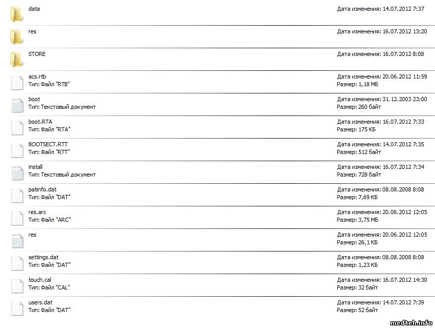 Самый простой вариант восстановить работоспособность прибора – удалить один из файлов на диске . 1. Снять крышку корпуса с прибора. 2. Со стороны маетринской платы прибора – найти на ней маленькую плату т.н. Dimm PC. 3. На этой плате – в слоте , стоит карта памяти MicroSD. Снять ее и поставить в адаптер, который можно устанавливать в картридеры на обычных РС 4. Открыть диск NicroSD на PC 5. В корне диска находится несколько файлов (см. скрин с диска) 6. 7. В списке файлов есть – touch.cal Его нужно удалить. Потом вернуть карту MicroSD обратно в прибор и включить его. 8. После загрузки – согласно инструкции к пибору, запустить и проделать калибровку экрана. 9. Система создаст новый файл калибровки экрана и все должно далее работать.