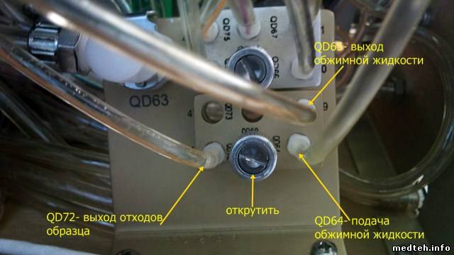 вначале, чтобы открыть блок клапанов(lower pneumatic drawer), сначала открутил фиксирующий его болт, затем отсоединил трубку подачи сжатого воздуха, вытянул немного блок к себе, после отсоединил коннектор отходящий от резервуара сброса промывочной жидкости, затем отсоединил коннекторы J1, J2. теперь можно еще немного потянуть на себя блок и отсоединить сзади блока общий коннектор подачи обжимной и промывочной жидкости, а также там же и трубки для сброса отходов(красная защелка ходит влево-вправо). теперь можно полностью вытянуть аккуратно блок,и найти трубки которые забились, главное не запутаться, т.к. там целый ворох трубок. также когда обратно ставить будете трубки могут перегнуться. затем поставил поставил все обратно. потом приступил к проверке проходимости самой проточной кюветы. для этого заглушил отверстие подачи образца(главное чтоб потом там не забилось и не попало посторонних элементов-ворса и т.п.), также открутил болт держащий планку с трубками QD64, QD65, QD72. и также заблокировал QD72. а в QD64 начал вливать дист.воду из трубки QD65 должна пойти вода, потом открыл QD72 и закрыл QD65, из QD72 также должна пойти вода. после поставил все на место, включил цитометр, прогрел. выгнал еще раз воздух из системы с помощью кнопки Air vent, и начал прогонять prime до тех пор пока в трубках с маркировкой 64 и 65, что идут к кювете не исчезнут все пузырки воздуха, иногда вместо prime делал cleanze. после этого несколько раз сделал все процедуры промывки, cleanse panel и.т.д. после провел flowcheck и проверил результаты.