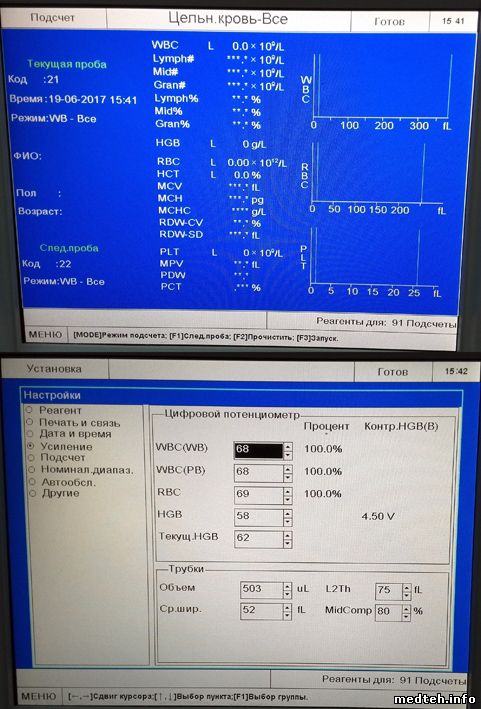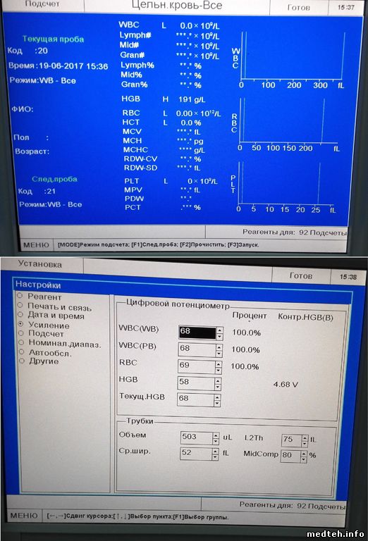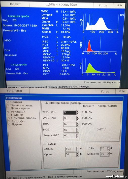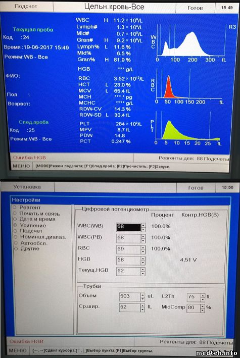 Итак, первая картинка - бланк, вторая картинка - выставил напряжение в 4,5 В и результат бланка идеальный. Третья картинка - пациент (гистограмма странная по WBC) и HGB не показывает, четвёртая картинка - тот же пациент после регулировки напряжения, HGB показывает, но результат некорректный (подсчитано ручным способом - 120) и "слетело" напряжение.